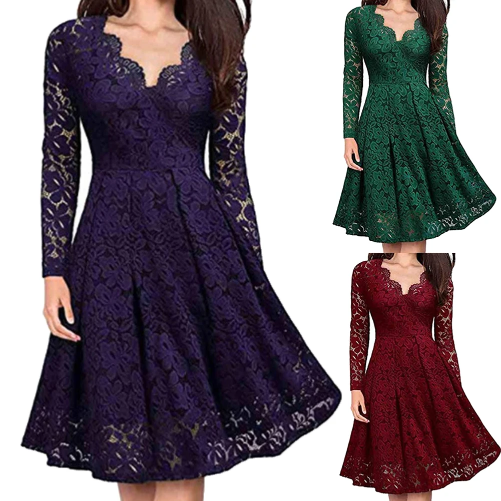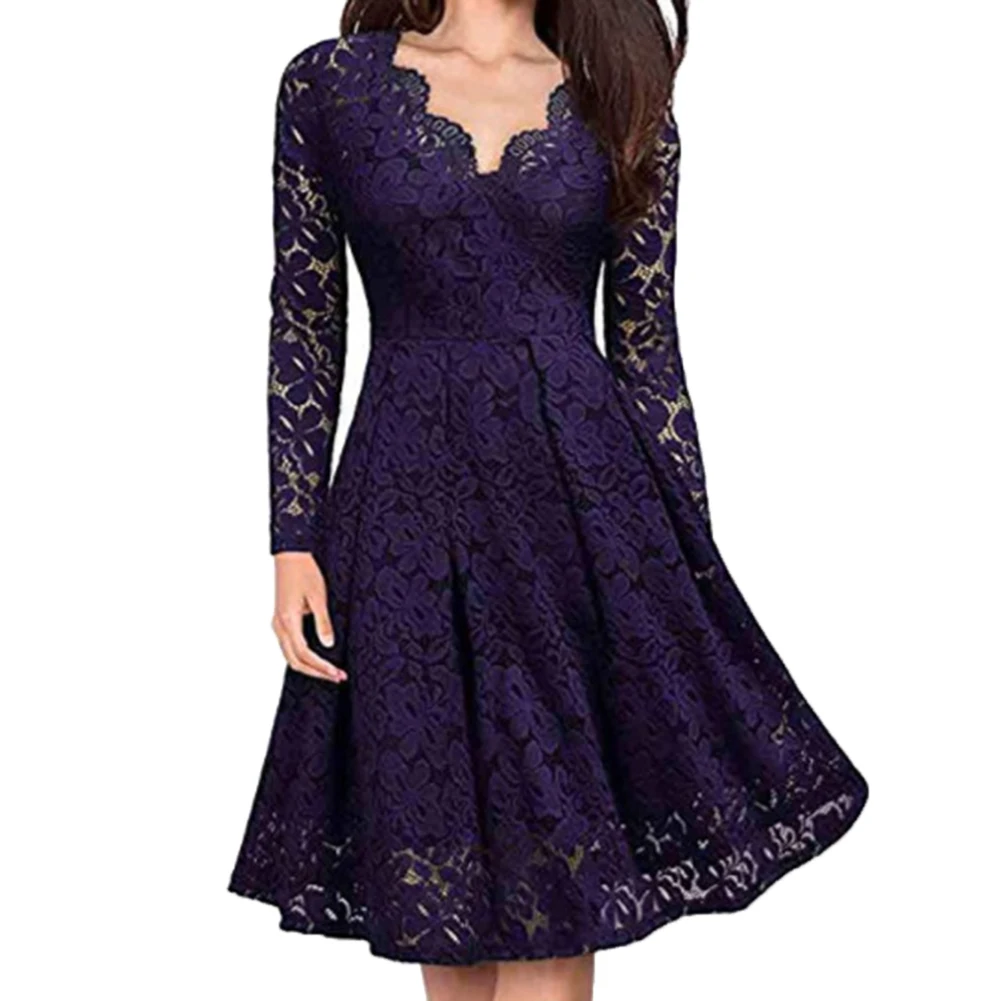 Платье женское кружевное ТРАПЕЦИЕВИДНОЕ, с V-образным вырезом и длинным рукавом