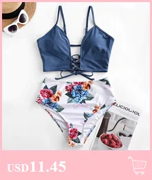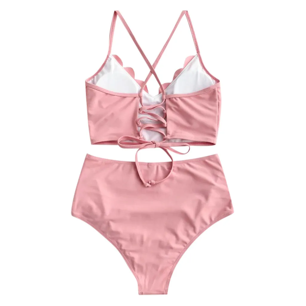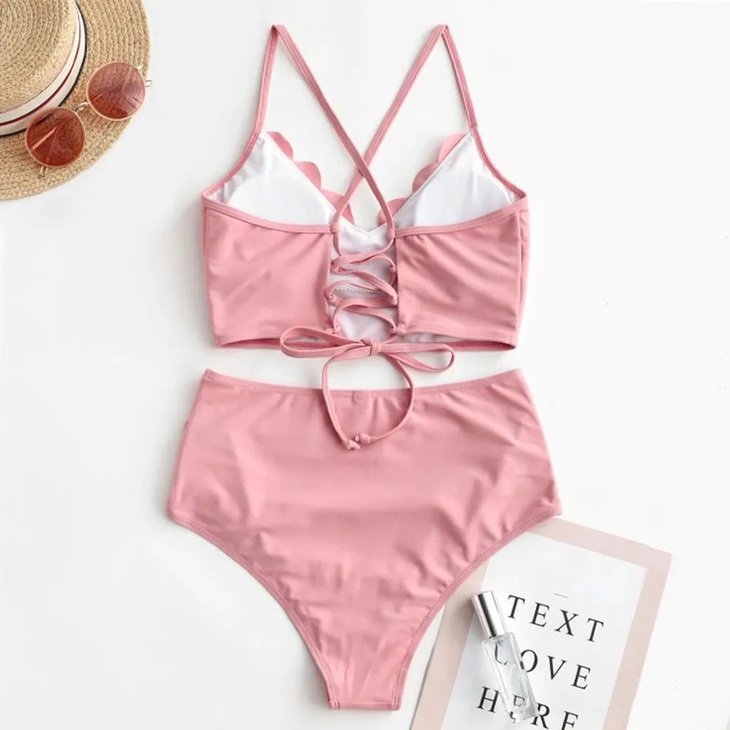 Женский купальник-танкини с зубчатыми краями, перекрещивающимися крест-накрест, на шнуровке, со съемным мягким лепестковым боковым ремешком на спине # T1G1