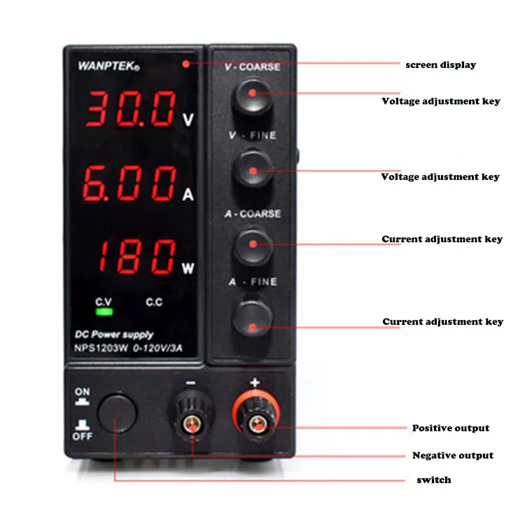 Особенности:-Маленький размер, светильник вес и высокая плотность мощности.-Постоянное напряжение, автоматическое переключение постоянного тока.-Отображение напряжения, тока, мощности 3 окна.-Контролируемый температурой вентилятор рассеивания тепла, низкий уровень шума и длительный срок службы.