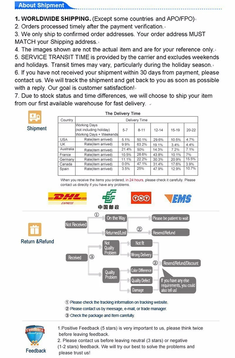 4. Мы отправим посылку в течение 3-7 дней после оплаты. Пожалуйста, укажите свой вес и рост при размещении заказа, если вы не уверены в своем размере. Возможна погрешность в 1-3 см (1 дюйм = 2,54 см 1 см = 0,39 дюйма).