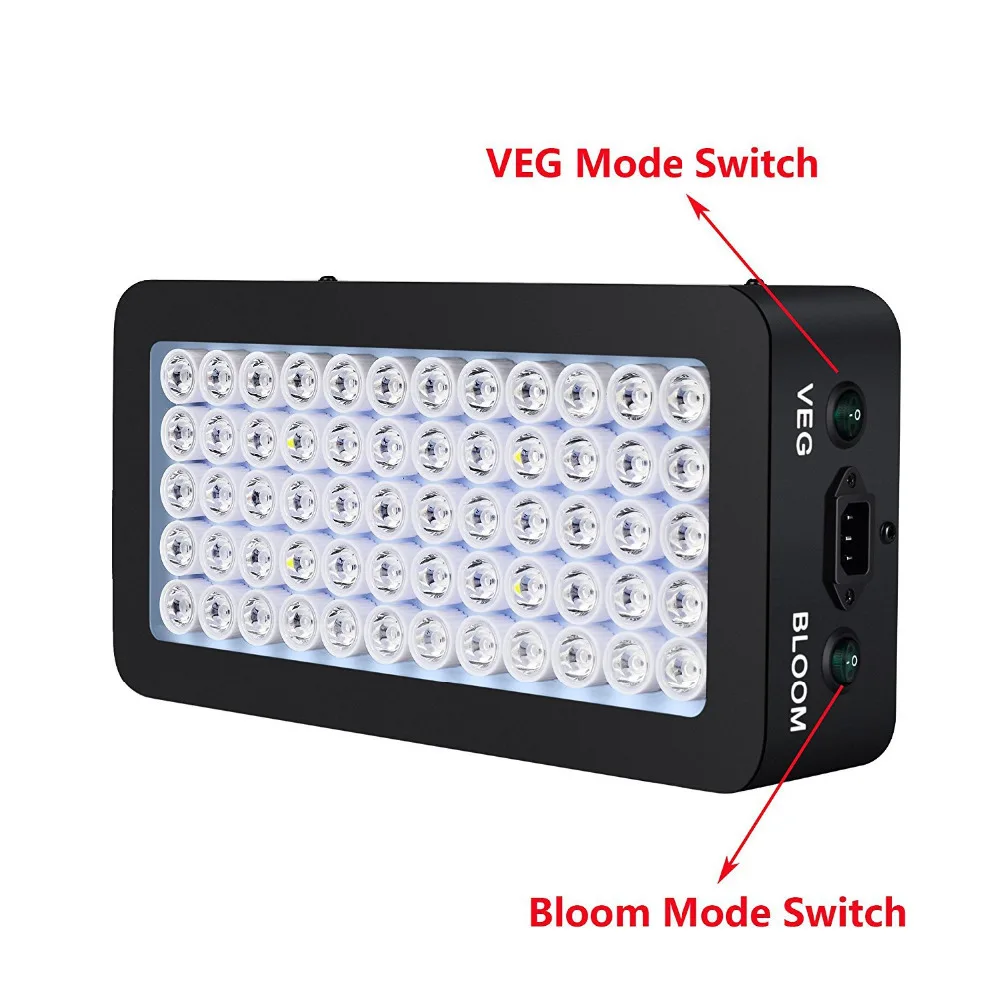 Двойной переключатель-кнопки Veg и Bloom имеют разные функции. Переключатель Veg: синий светодиод и белый светодиод. Для посадки или роста стадии растительного роста вы можете использовать только выключатель Veg. Переключатель Bloom: красный и белый светодиоды. Для цветения/цветения можно использовать переключатели Veg и Bloom.
