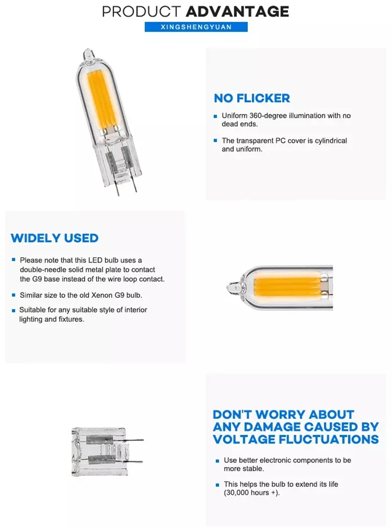 Тип основания: G4 Мощность: 6 Вт/9 Вт/12 Вт Замена: 30 Вт/40 Вт/60 Вт галогенная лампа Цветовая температура: теплый белый/холодный белый Входное напряжение: 220 В Угол луча: 360 ° Материал: стекло Срок службы: 50 000 часов CRI>85Ra Характеристика: Экономит более 90% электроэнергии. Супер длительный срок службы до 20 000 часов. Тщательно решить вашу проблему частого замены ламп. Международный стандарт G9 основание, подходит для всех G9 светильник. Экологически чистый, не содержит токсичных веществ, не содержит ртути, не содержит УФ-или инфракрасного излучения. Больше защиты ваших глаз.