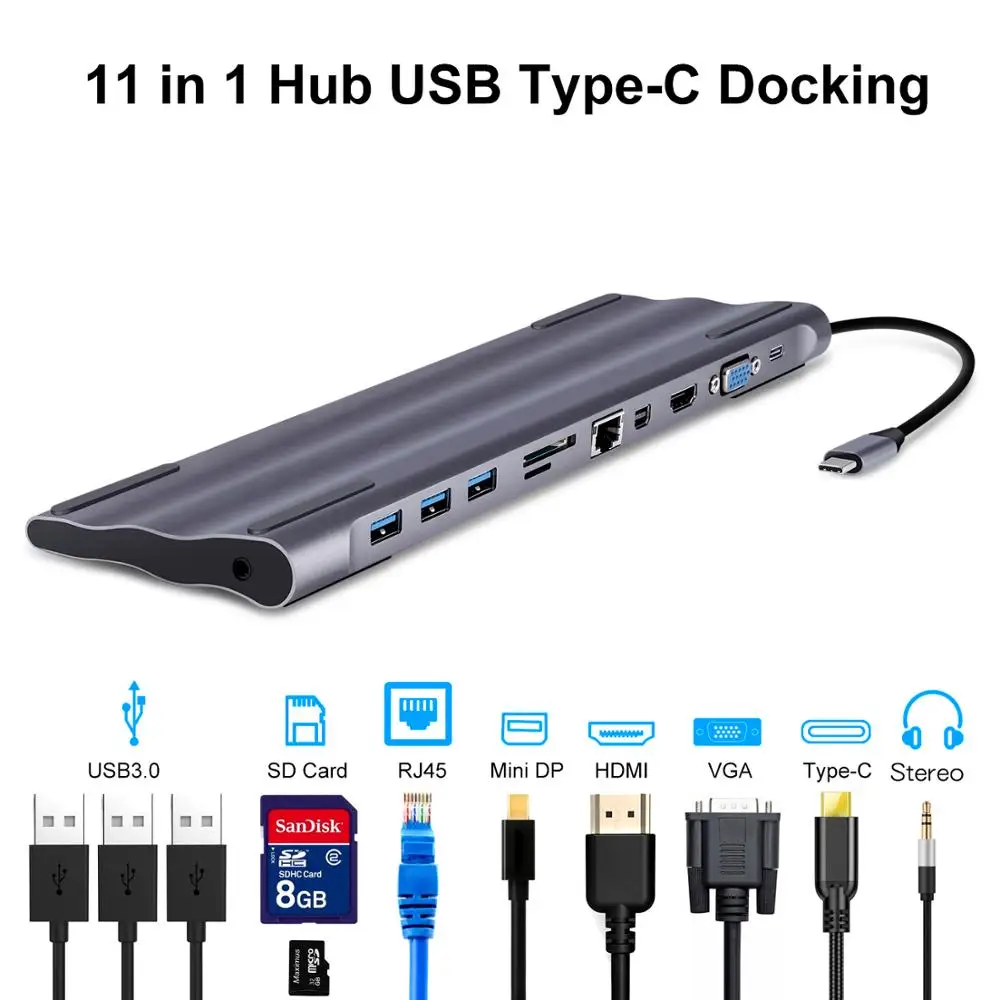 11-в-1 usb-хаб: 3 * USB3.0 + SD + MCRO SD + RJ45 + дисплейный порт MiniDP типа «+ HDMI + VGA + Тип-C + стерео