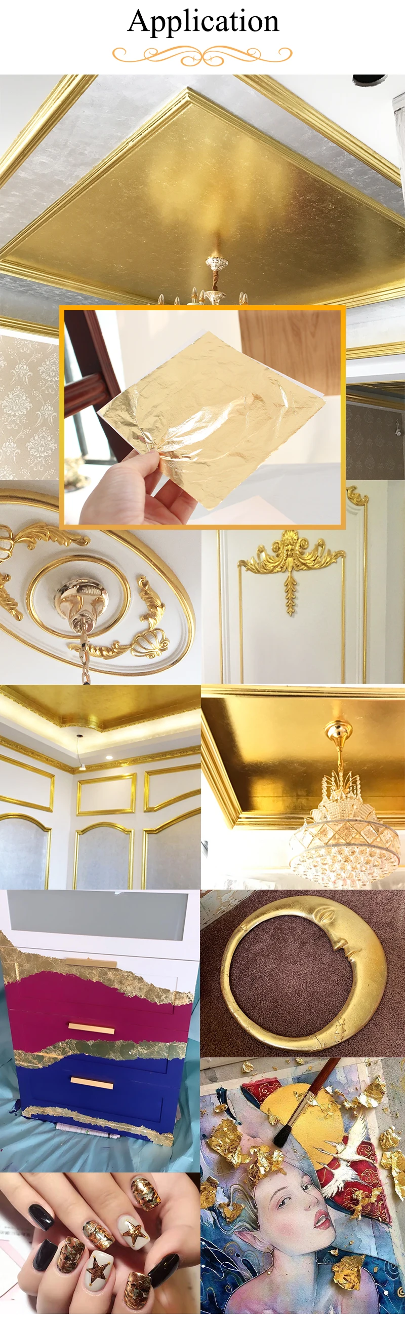 Применение: имитация золотых листьев подходит для позолоченных картин статуй, керамики, стен, золочения, изготовления украшений, мебели, картин, дизайна интерьера и художественной работы. Они также могут использоваться в гвоздях и полимерной глине.