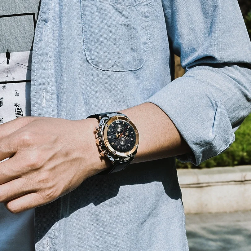 Часы-хронограф мужские Кварцевые водонепроницаемые с кожаным ремешком