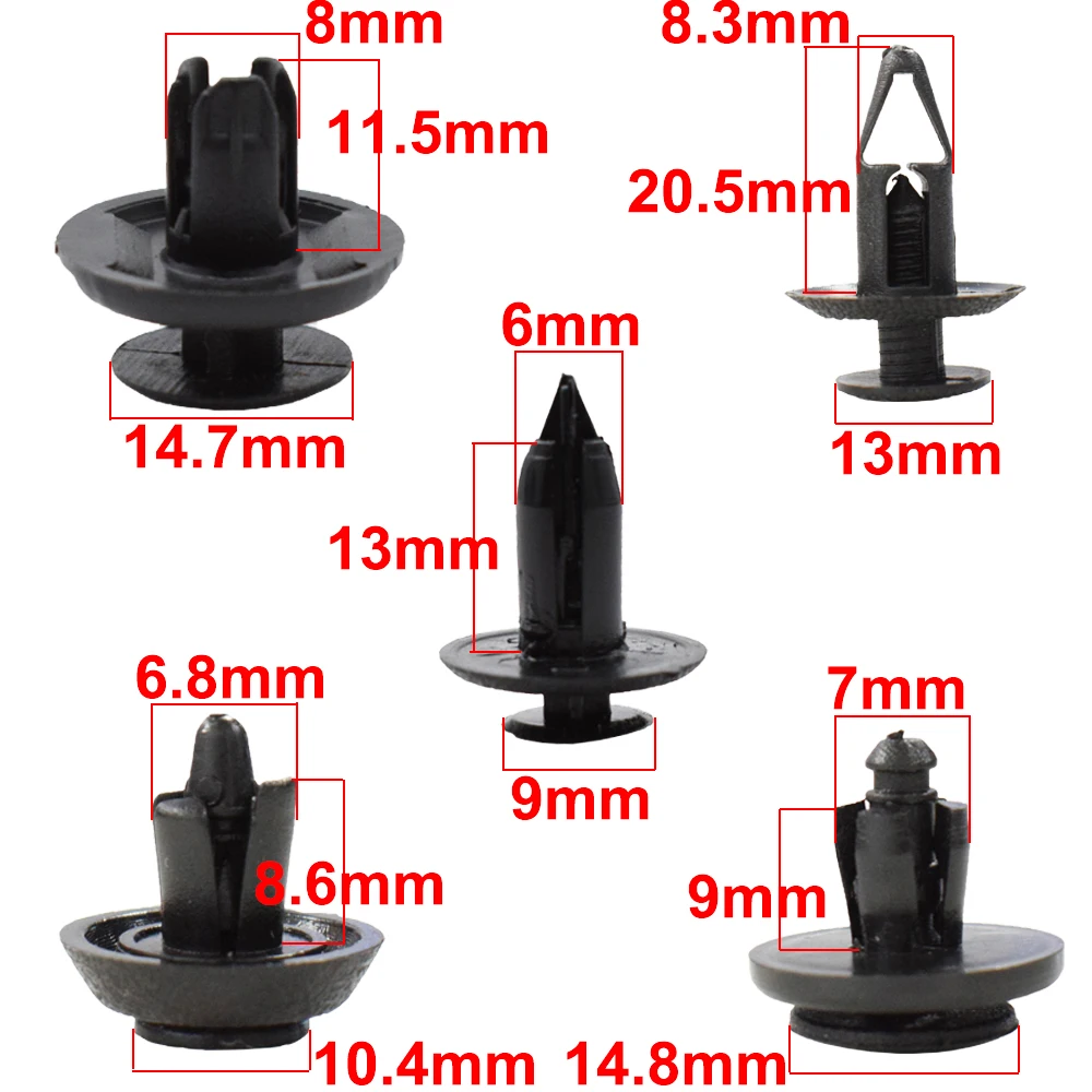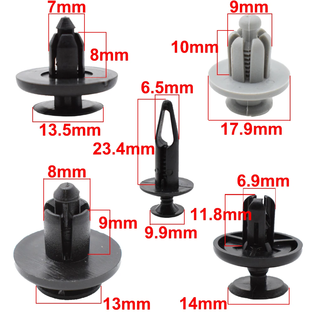 Особенности:Эти заклепки изготовлены из пластика, подходящего для использования в автомобиле.Хороший автомобильный аксессуар, обычно используется для установки боковых юбок, бамперов и другой отделки.Их можно использовать в автобусах, поездах, самолетах, грузовиках, автомобилях.Вставной тип, изготовлен из пластика, подходит для отверстия диаметром 6,8-9 мм.