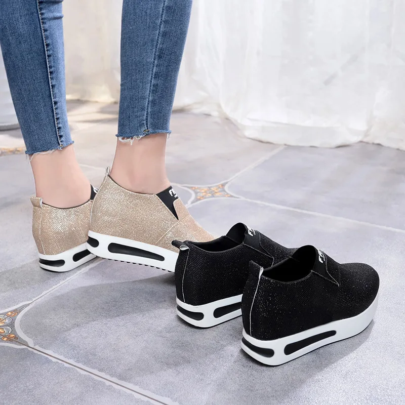 Туфли с блестками; Золотистые и черные кроссовки на танкетке; Женск...