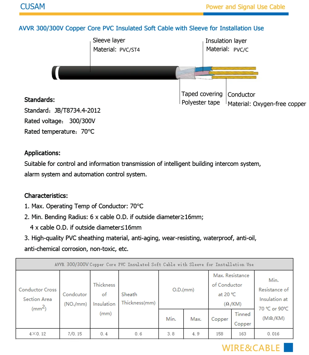 Характеристики: 1. Макс. Рабочая температура проводника: 70 ℃ 2. Минимальный радиус изгиба: 6 x Кабель O.D., если наружный диаметр 16 мм; 4 x Кабель O.D., если наружный диаметр 16 мм 3. Высококачественный ПВХ материал обшивки, антивозрастной, износостойкий, водонепроницаемый, анти-Масляный, Антихимическая коррозийная, Нетоксичная и т. Д.
