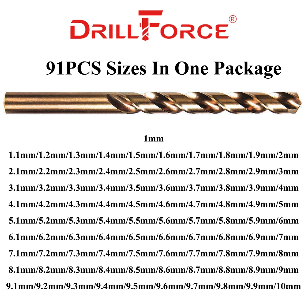 Набор кобальтовых сверл Drillforce 91 шт., 1-10 мм, M42 8%, набор сверл для HSS-CO, для сверления на закаленной стали, чугуне и нержавеющей стали