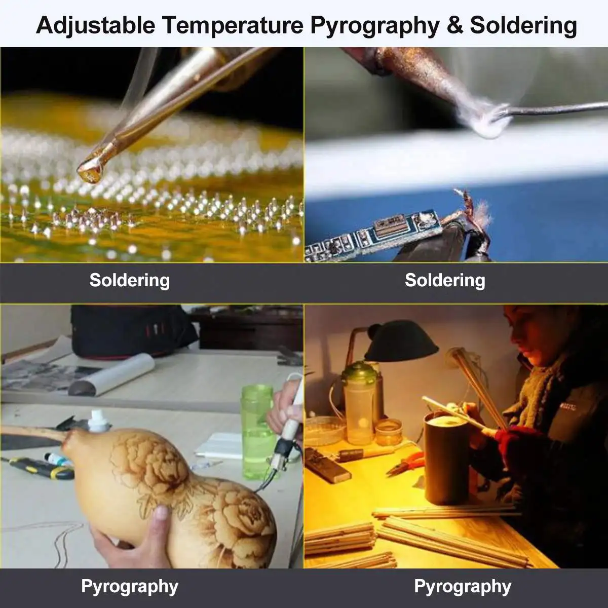 Особенности:-Нагревание быстрее, термостат цепи и высокая прочность.-Дизайн с диапазоном регулировки температуры: 200-450 ℃.-Энергоэффективность, энергопотребление на 70% ниже, чем обычно.-Ручка с высокой термостойкостью sillicon tube, удобная и безопасная.-Подходит для: пробки, кожи, некоторых бумаг, даже восковых свечей, дерева, таких как бук, sycamore, береза или граб.-Отлично подходит для проектов по сжиганию дерева (пирография), отслеживания и окрашивания в ваших дизайнах, переноса узоров, работы с кожей и т. д.