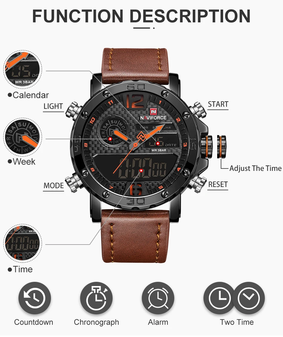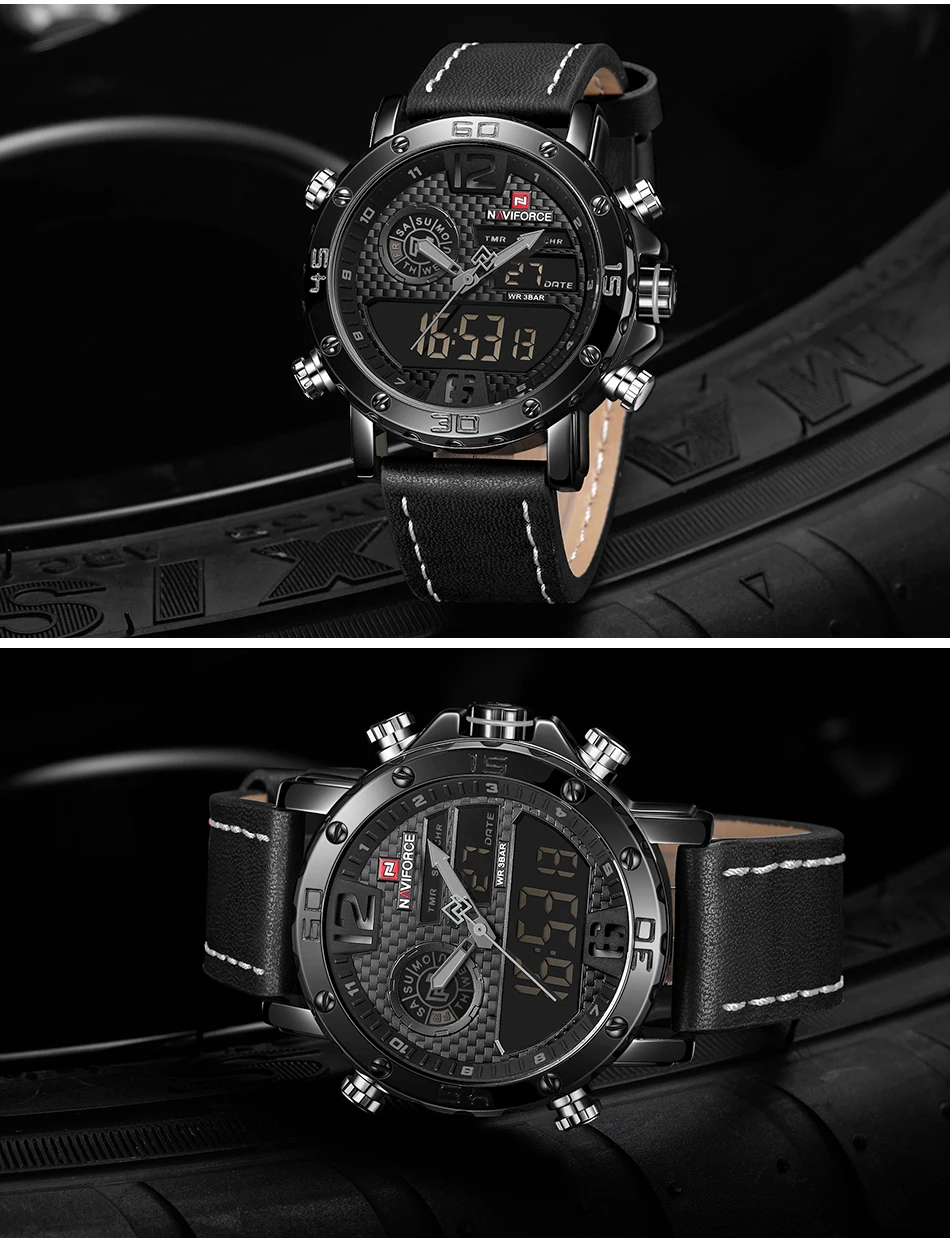 Модель: NAVIFORCE NF9134 Мужские часы от роскошного бренда, мужские кожаные спортивные часы NAVIFORCE, Мужские кварцевые светодиодный цифровые часы, водонепроницаемые военные наручные часы