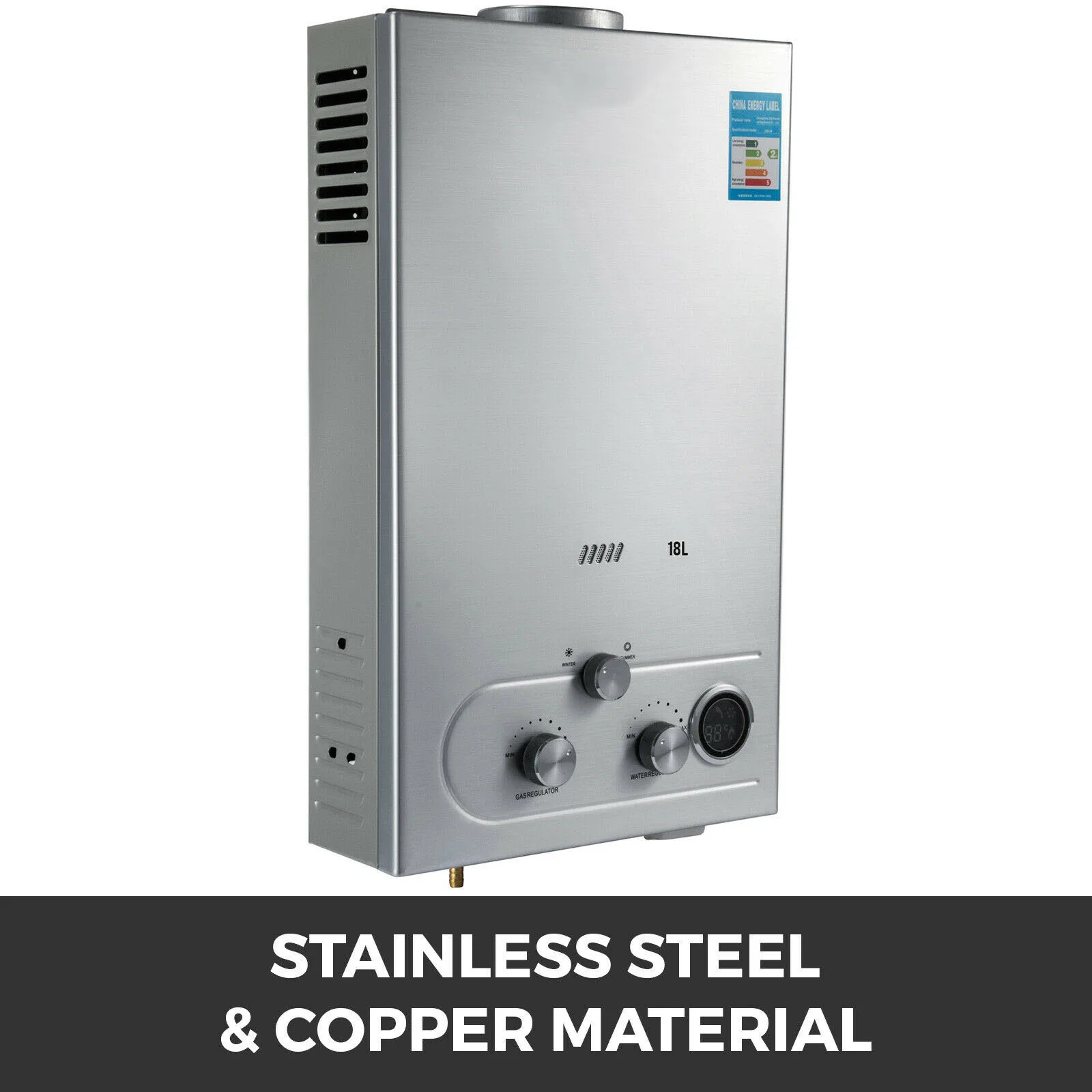 Ключевые особенностиНержавеющая сталь и медный материалМатовый чехол из нержавеющей стали, водонепроницаемый и модный. Внутренние медные устройства с покрытием из олова, не легко создавать инкрустацию, устойчивость к ржавчине и высоким температурам. Он может увеличить теплопроводность и> = 80,8 тепловой эффективности.Регулируемая газовая и горячая водаРегулятор управления газом: по часовой стрелке для увеличения подачи газа. Ручка управления водой: по часовой стрелке, чтобы получить больше горячей воды. Летняя и зимняя Ручка: предназначен для экономии энергии 40% (отключение пожарных рядов 1/4 летом). Есть светодиодный экран для отображения температуры воды в реальном времени.Защита автомобильного коллектораЭтот водонагреватель прошел CE тесты, он предлагает мульти защиту: защита от перегрева (75), защита от низкого расхода воды, защита от замерзания, защита от давления воды, отсутствие защиты от пламени, 20 мин таймер и т. Д.Высокая Эффективность сжигания газаИспользуйте жидкий пропановый газ (LPG) в качестве основного источника энергии, с передовой горелкой T13, полностью закрытой структурой сгорания, обеспечивают равномерный огонь и высокую эффективность горения для экономии газа. Автоматическое отключение газа под неожиданным пламеном, таким образом, для обеспечения безопасности при использовании.