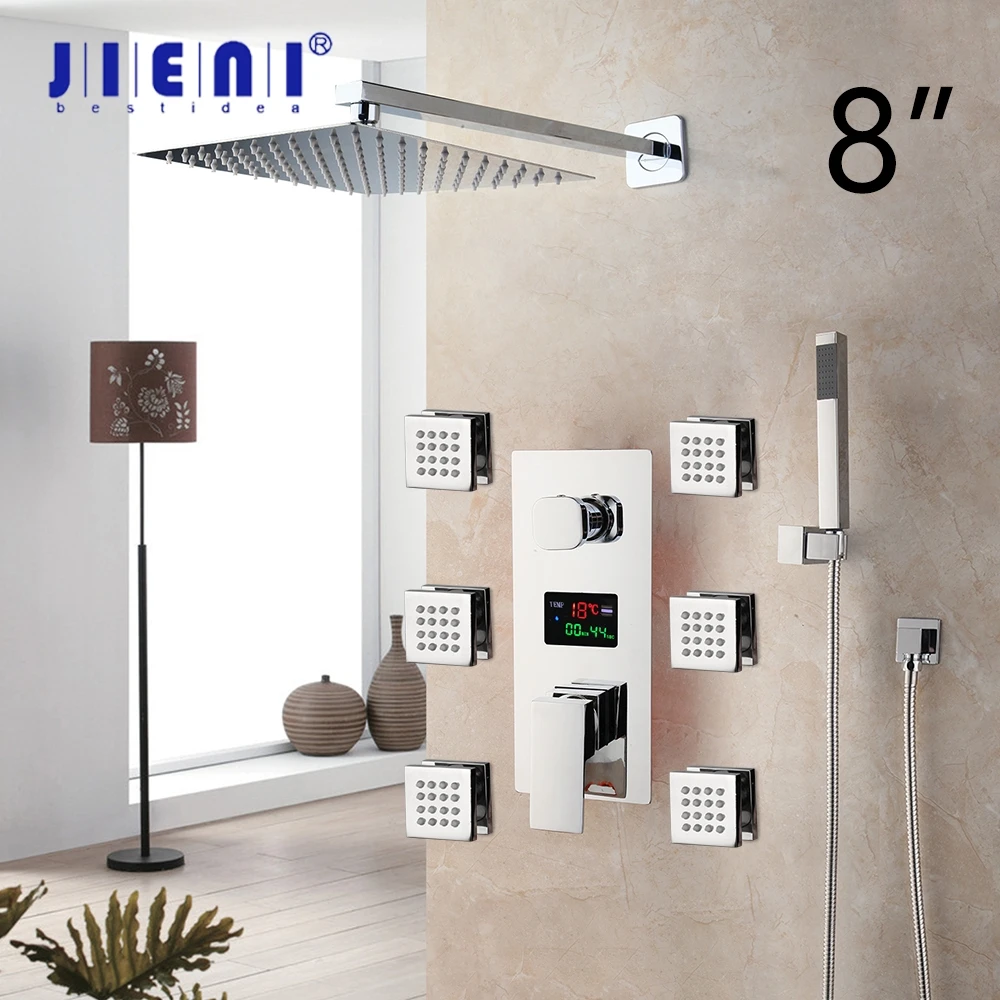 JIENI 8 10 12 16 дюймов светодиодный душевой набор для ванной комнаты, кран, квадратный хромированный латунный душ с креплением на потолок, набор для душа