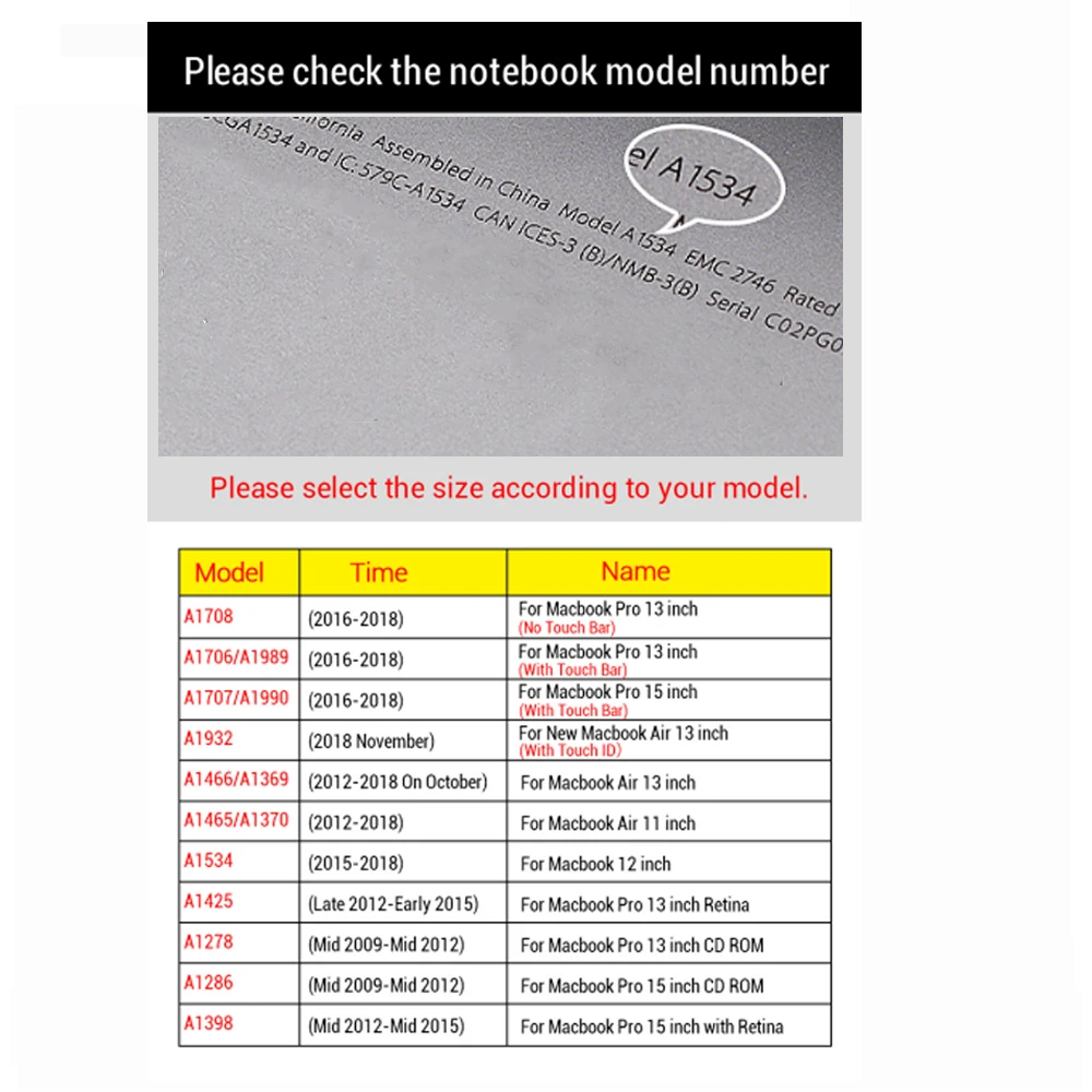 Для Macbook TPU прозрачный защитный силиконовый чехол для клавиатуры Air A1465 12 A1534 Pro A1502 A1278 A1398 защитная пленка против пыли НовинкаAir 11Для Macbook Air 11,6 дюймовНомер модели: A1465, A1370, MD223, MD224, MC505, MC506, MC968, MC969, MD71112 дюймовДля Macbook 12 дюймов Retina A1534Air 13Для Macbook Air 13,3 дюймовНомер модели: A1369, A1466, MD760, MD761, MD231, MD232, MC233, MC234, MC503, MC504, MC965, MC966, MB233, MB234, MB003, MB504, MB543 13 Pro с RetinaДля Macbook Pro с Retina 13,3 дюймовНомер модели: A1502, A1425, MD212, MD213, ME864, ME865, ME866 13 Pro без RetinaДля Macbook Pro 13,3 дюймов (Без Сетчатки)Номер модели: A1278, MD101, MD102, MD313, MD314, MC374, MC700, MC724, MB990, MB991 15 Pro с RetinaДля Macbook Pro с Retina 15,4 дюймовНомер модели: A1398, MC975, MC976, ME664, ME665, ME293, ME294 15 Pro без RetinaДля Macbook Pro 15,4 дюймов (Без Сетчатки)Номер модели: A1286, MD103, MD104, MD318, MD322, MC118, MC024, MC371, MC372, MC373, MC721, MC723, MB133, MB470, MB471, MB985, MB986, MA896Пожалуйста, обратите внимание на модель компьютера после размещения заказа