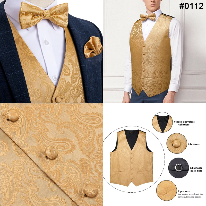 Мужской классический жилет с узором пейсли, золотистый Шелковый жилет с галстуком-бабочкой и запонками, вечерние жилетки для свадьбы
