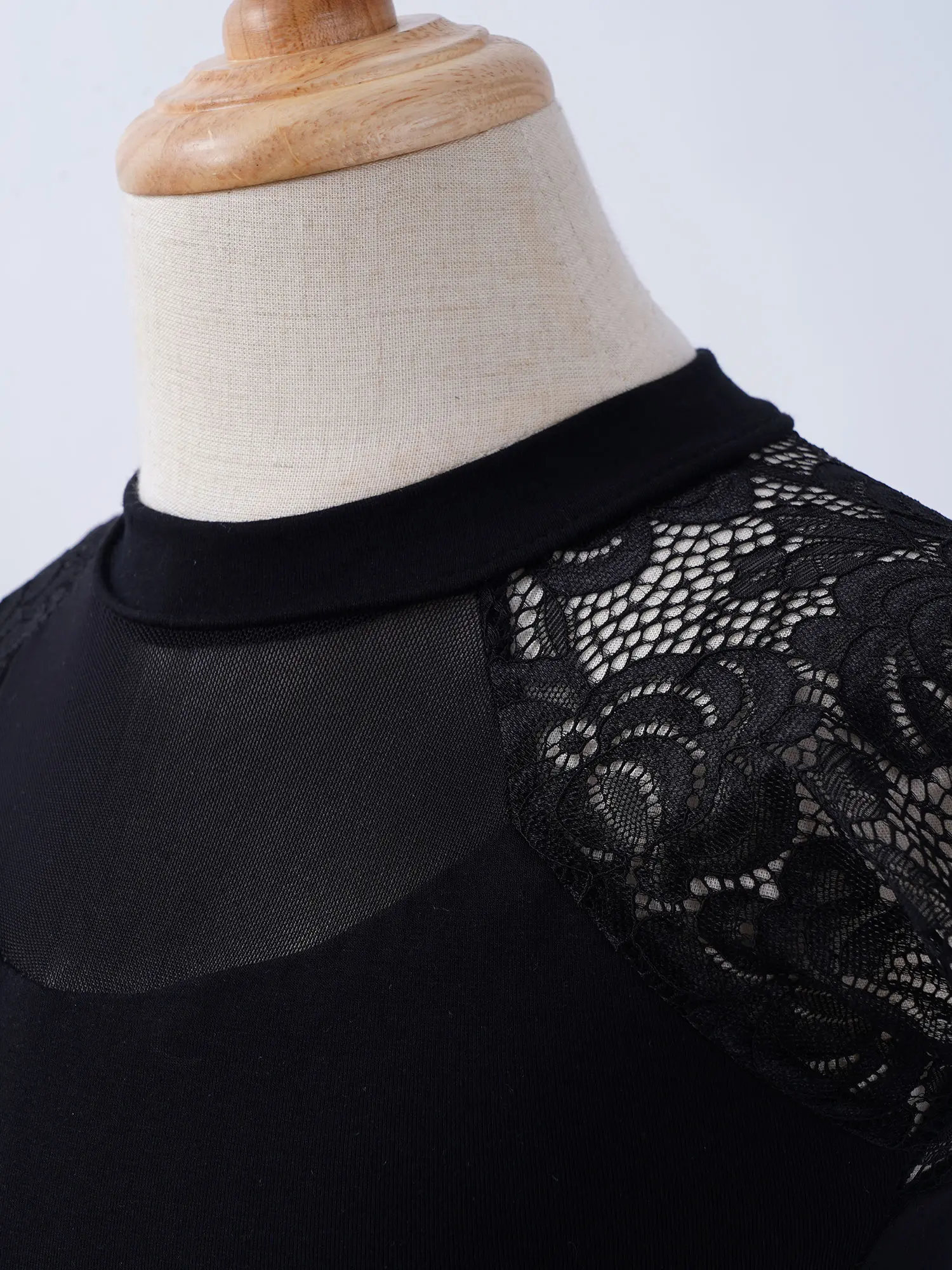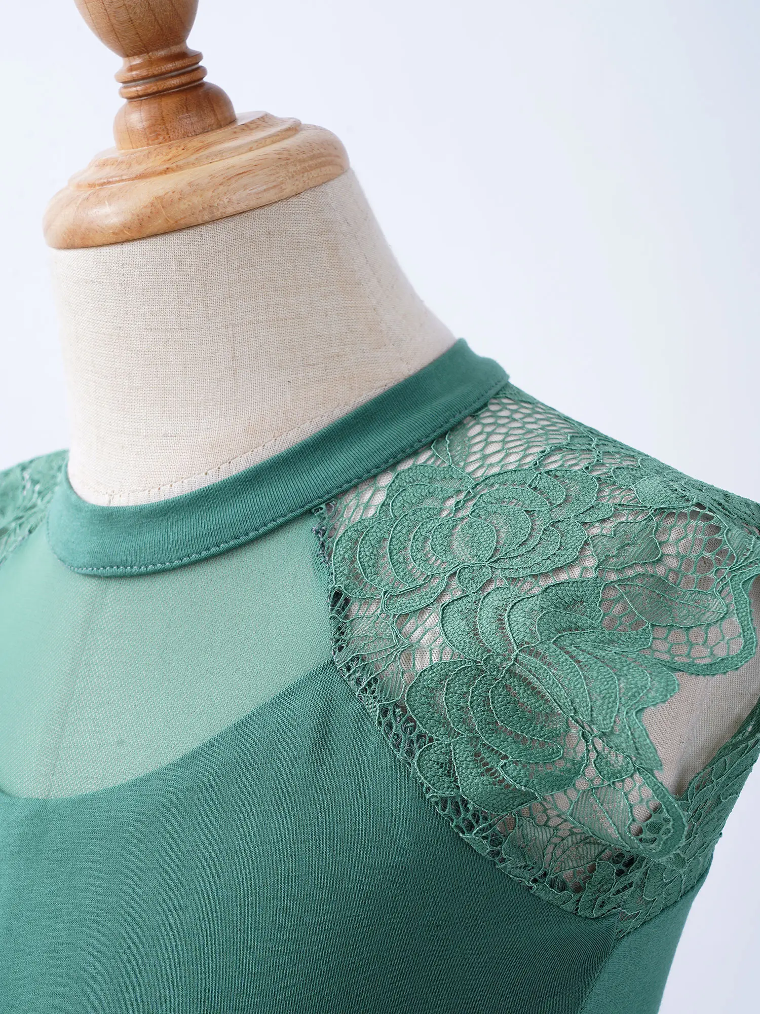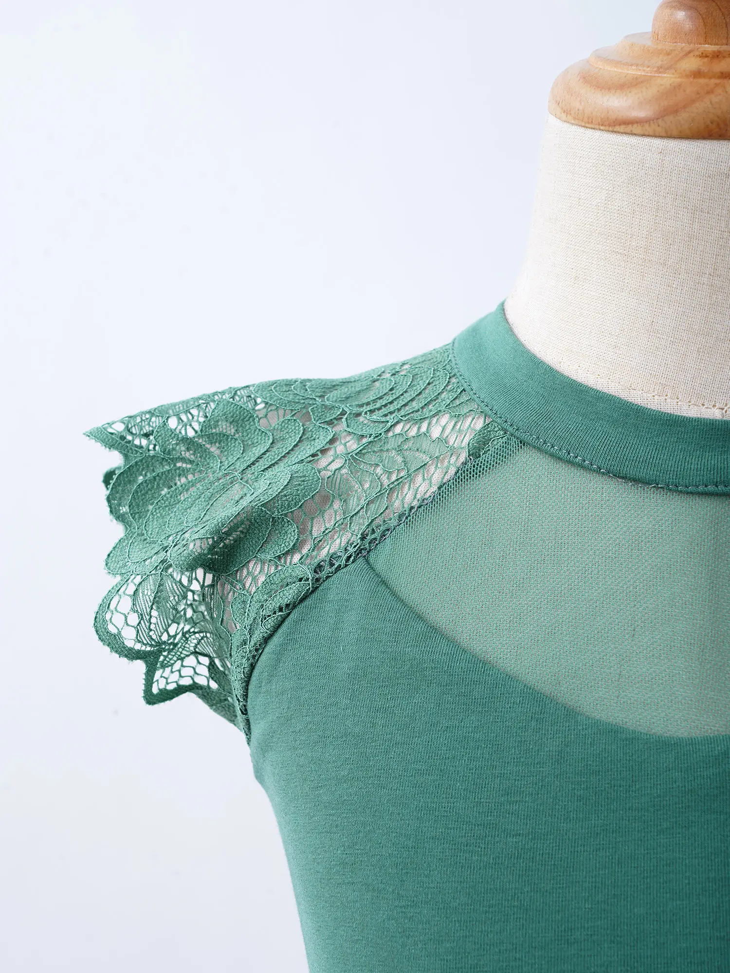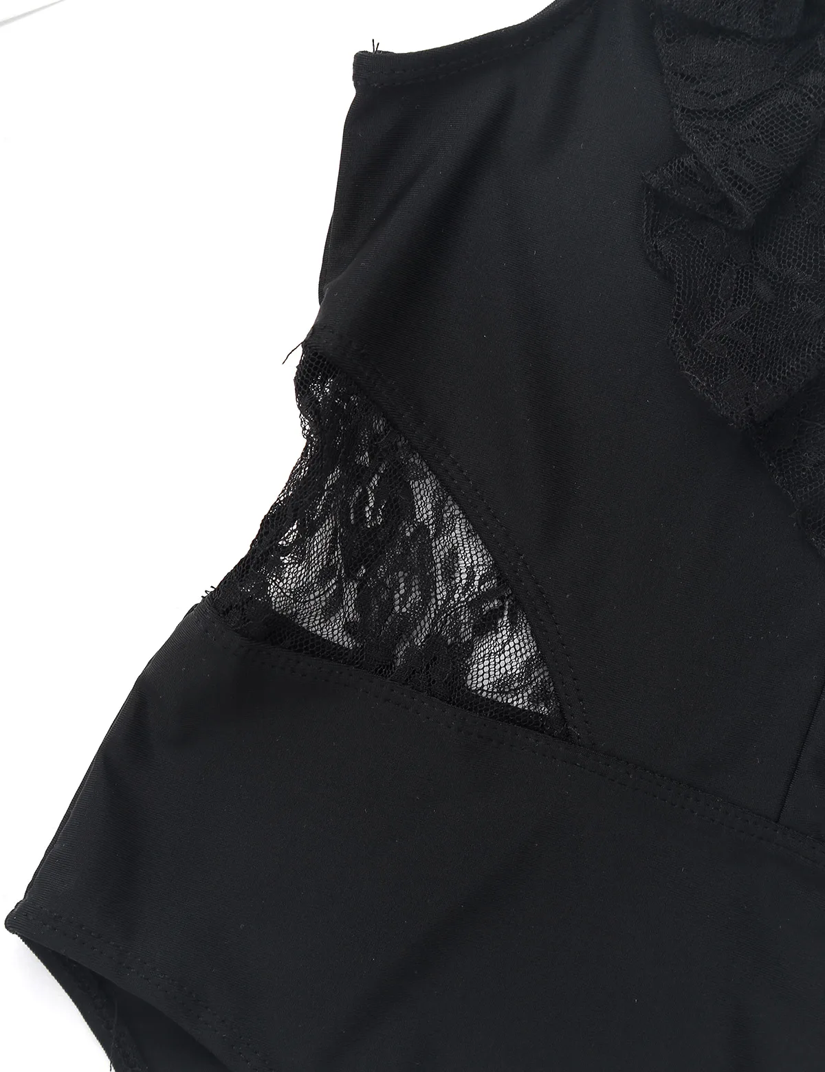 Без рукавов, с ложной горловиной. Гофрированное v-образное кружевное соединение спереди и сзади. Скрытая молния сзади.