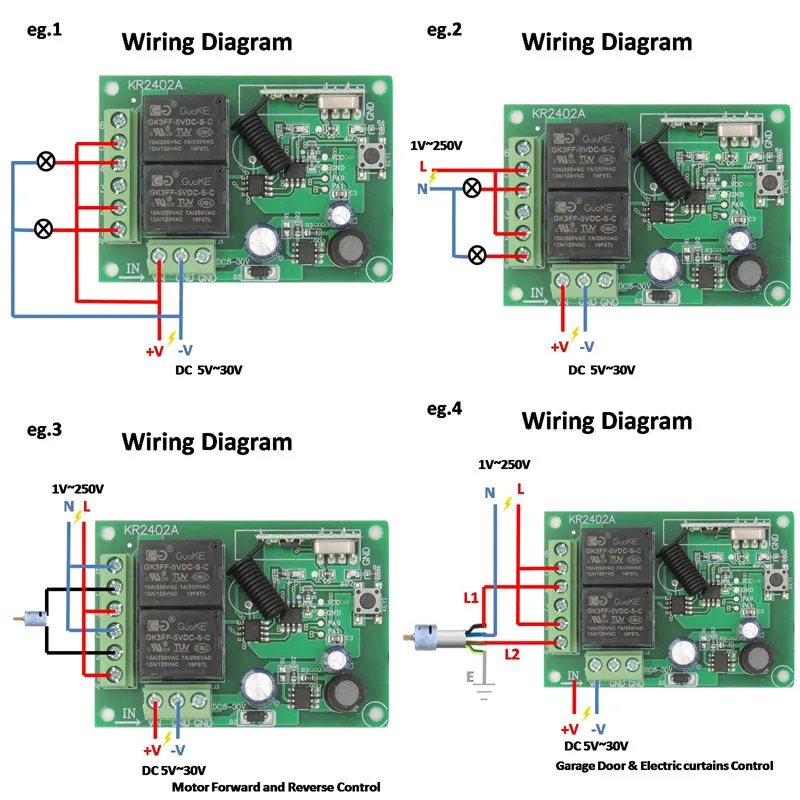 Рабочее напряжение: 5 В ~ 30 В постоянного тока Входное напряжение:1 ~ 250 В Выходная мощность:1 ~ 250 В Тихий ток:<5ма Максимальный ток: 10A Частота RF:433 МГц Рабочая температура:-30 ~ + 80 Чувствительность приема:> 97dbm Количество пульта дистанционного управления:25 шт. Поддержка кодирования:1527 код наклона/2262 фиксированный код Режим работы RF:Спросить Супергетеродинный беспроводной прием Диапазон приема:Открытое пространство более 50 метров Дистанционный режим работы:Мгновенный режим/Режим переключения/Режим блокировкиСхема проводки