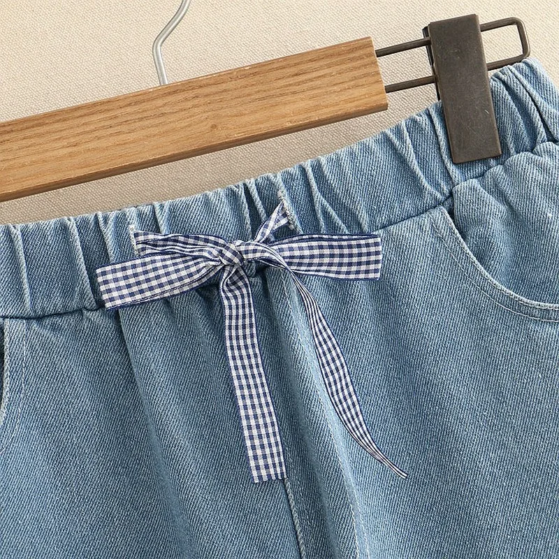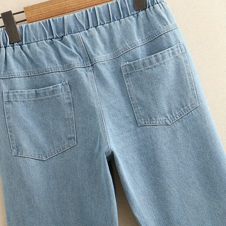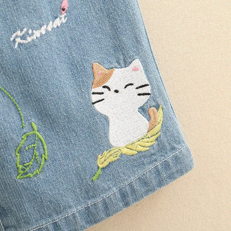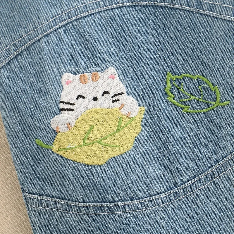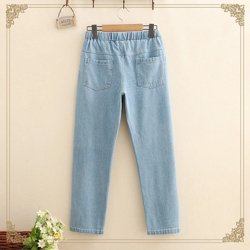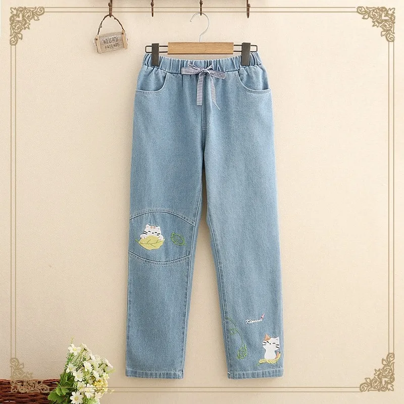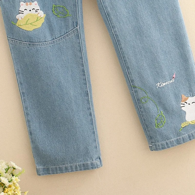 Женские эластичные джинсы с высокой талией, корейские свободные штаны с вышитым котом для девочек-подростков