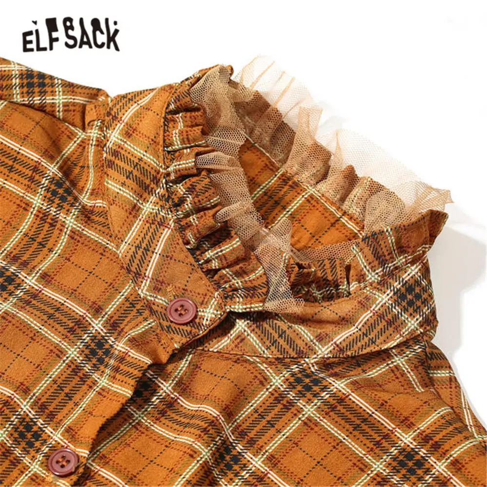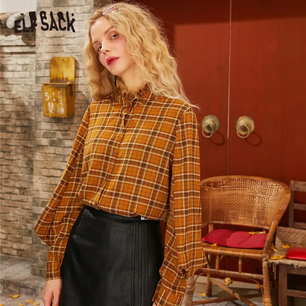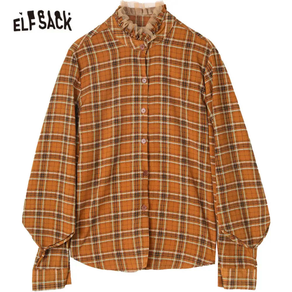 Женская карамельная клетчатая футболка ELFSACK, винтажные повседневные топы на каждый день с контрастной оборкой и рукавами-фонариками, весна 2020