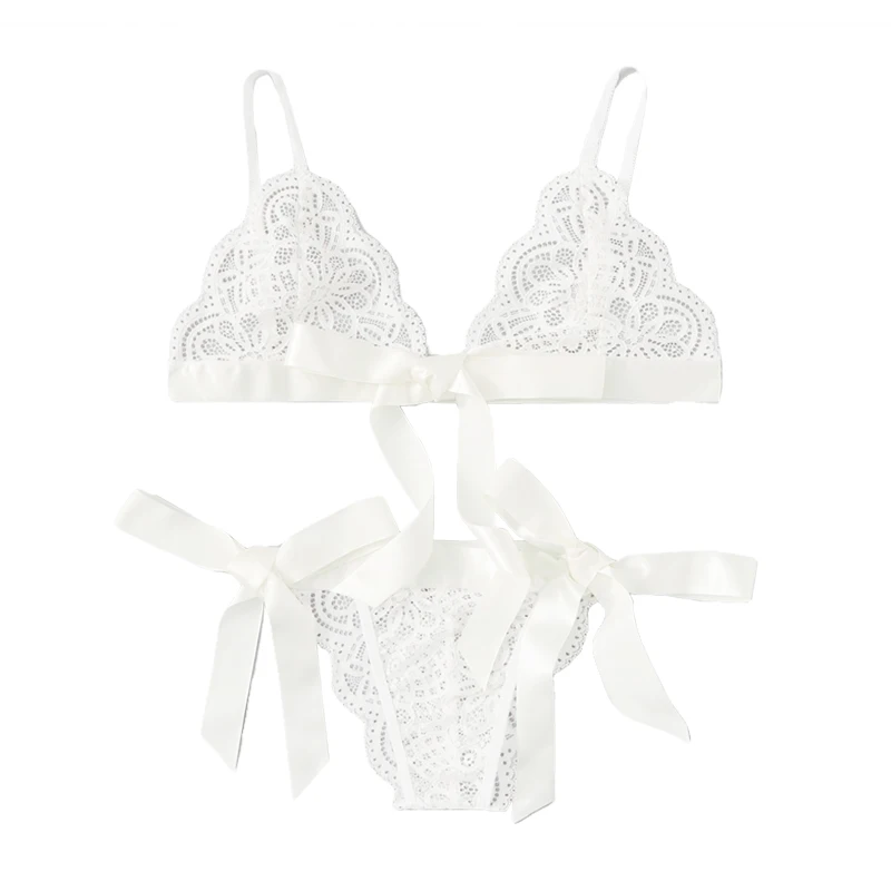 Комплект женского нижнего белья, кружевной прозрачный бюстгальтер с эффектом пуш-ап и трусики, с бантиком Сексуальное белье