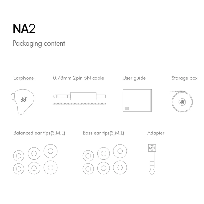 Наушники * 10,78 мм 2pin 5N кабель * 1Руководство пользователя * 1Коробка для хранения * 1Сбалансированные амбушюры (S.M.L)Наконечники для басов (S.M.L)6,35 до 3,5 адаптер * 1