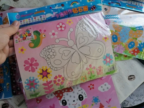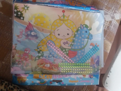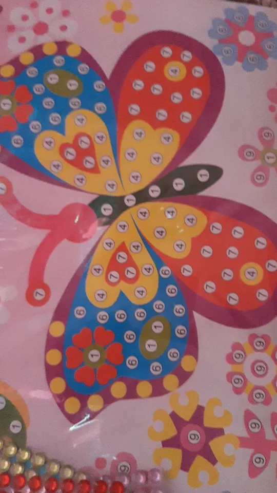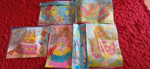 Han llegado un poco doblados son de cartón tamaño folio a4. Muy sencillos. Traen unas pegatinas de diamante y pone el número pero con el color es suficiente para saber hacerlos. Por la parte de atrás traen un dibujo para colorear