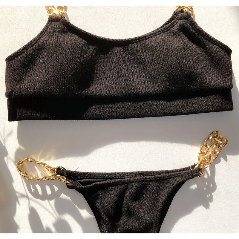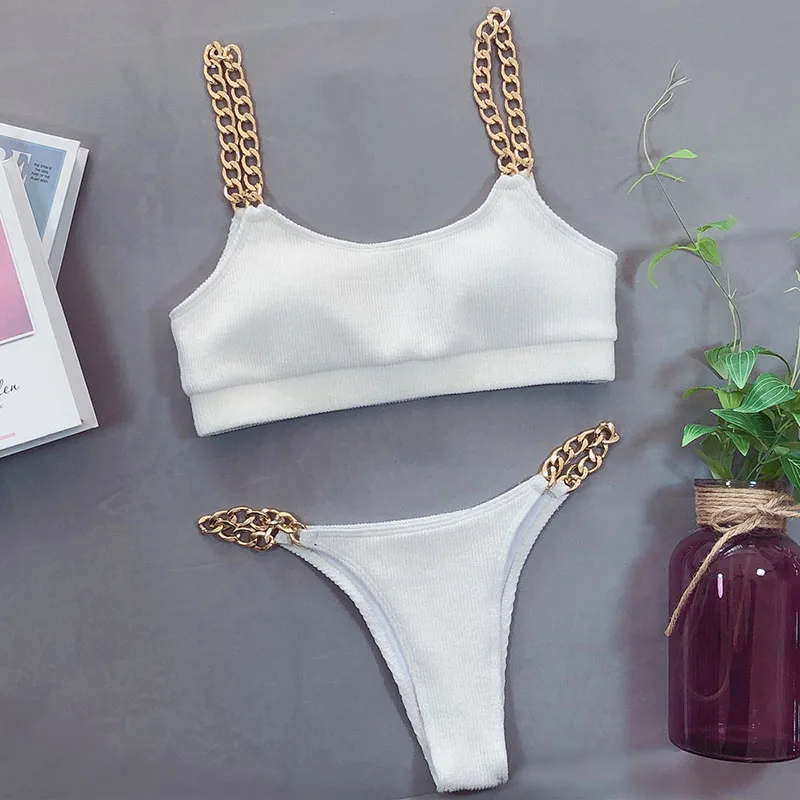 Новинка, женский купальник в рубчик с металлической цепочкой, Бразильское бикини, купальный костюм с высоким вырезом, женский купальник
