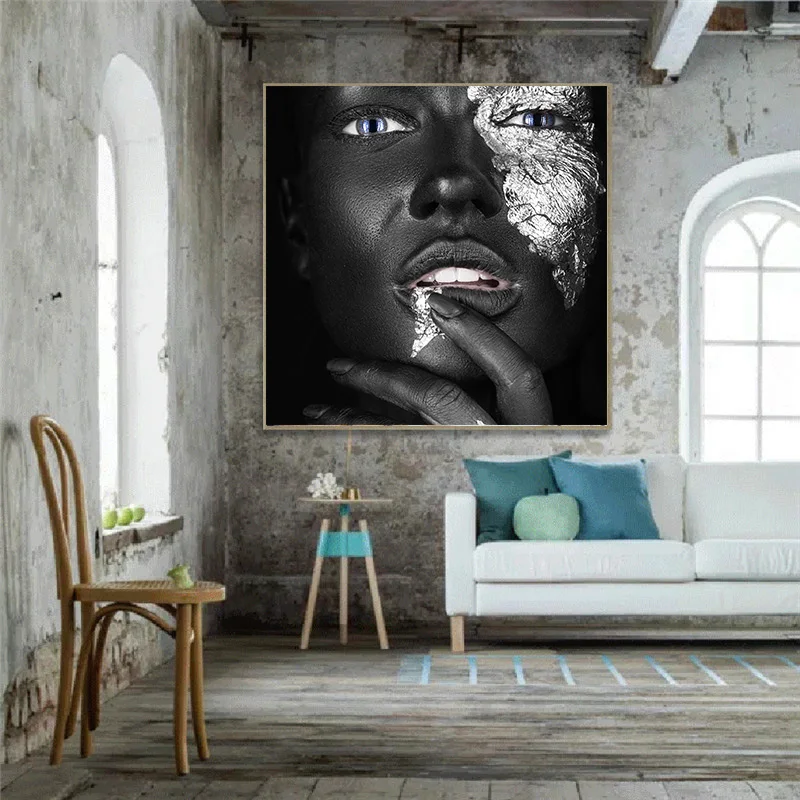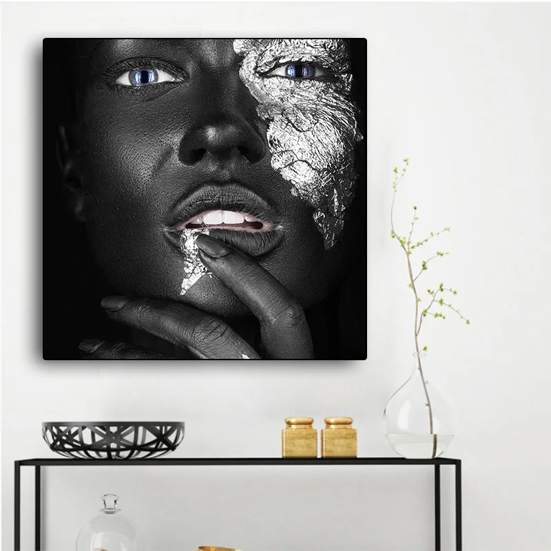 Постеры и принты картина маслом с изображением Африканской женщины на холсте, черные и серебряные, скандинавские настенные картины для гостиной
