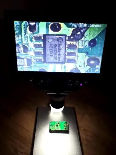 Работает отлично. Можно подключить к компьютеру, как внешнюю камеру. Встроенная подсветка правда бликует на печатной плате. Лечиться доп освещением.