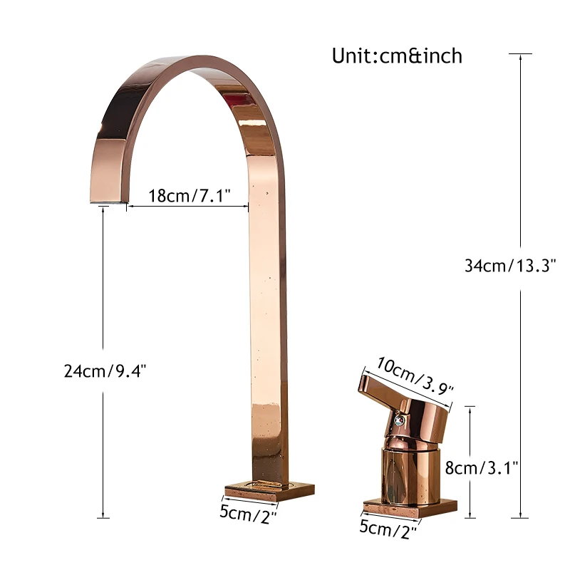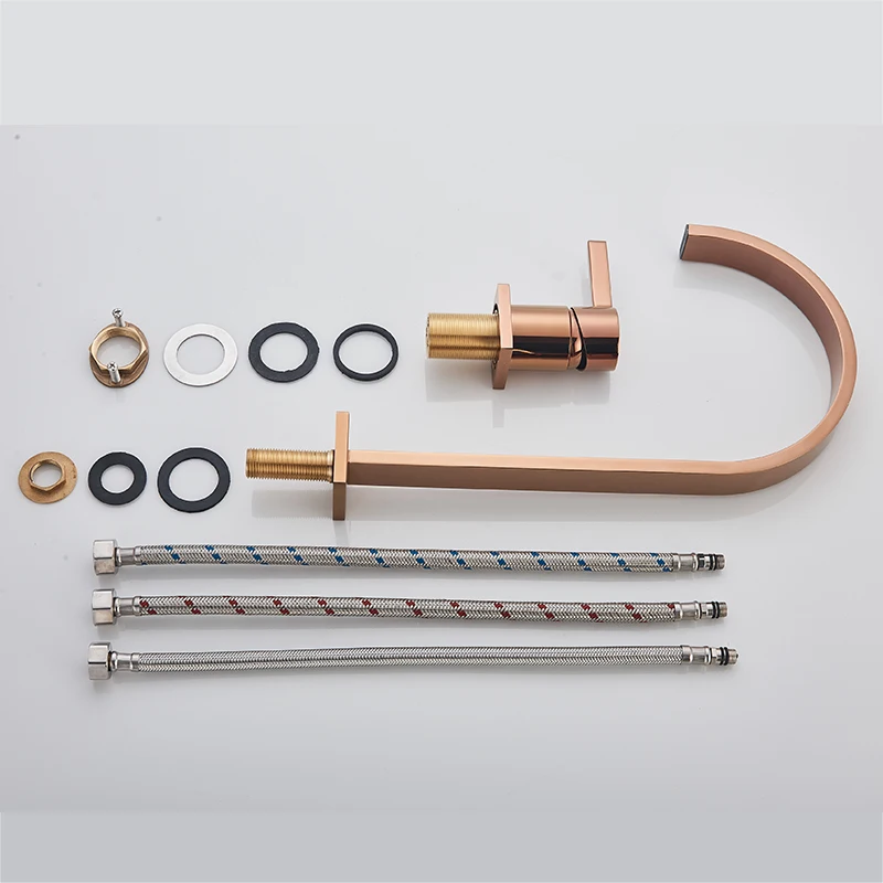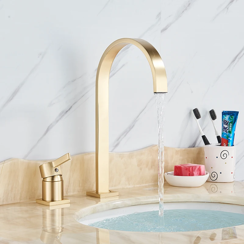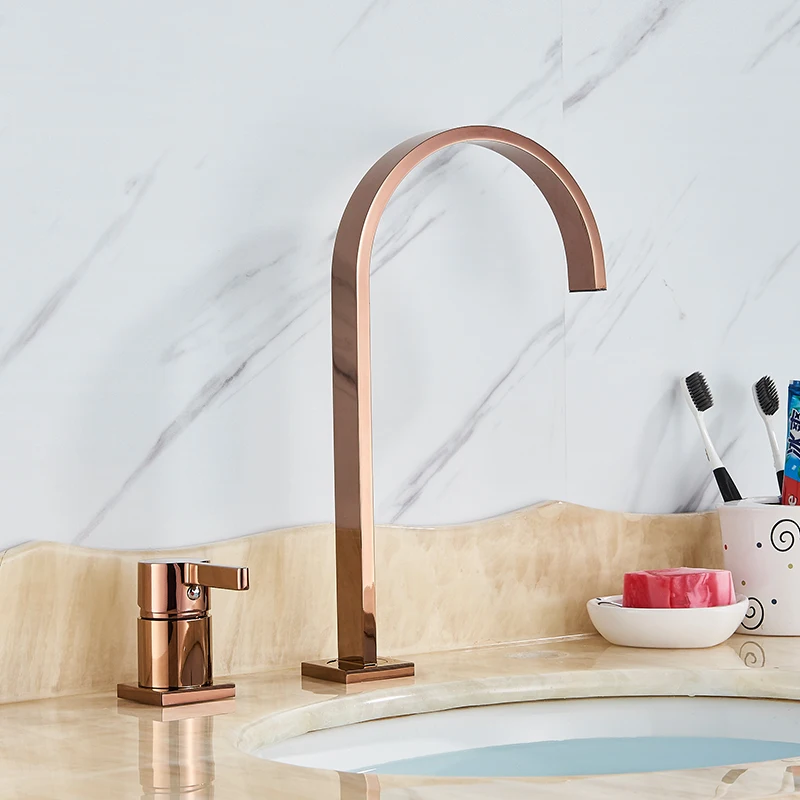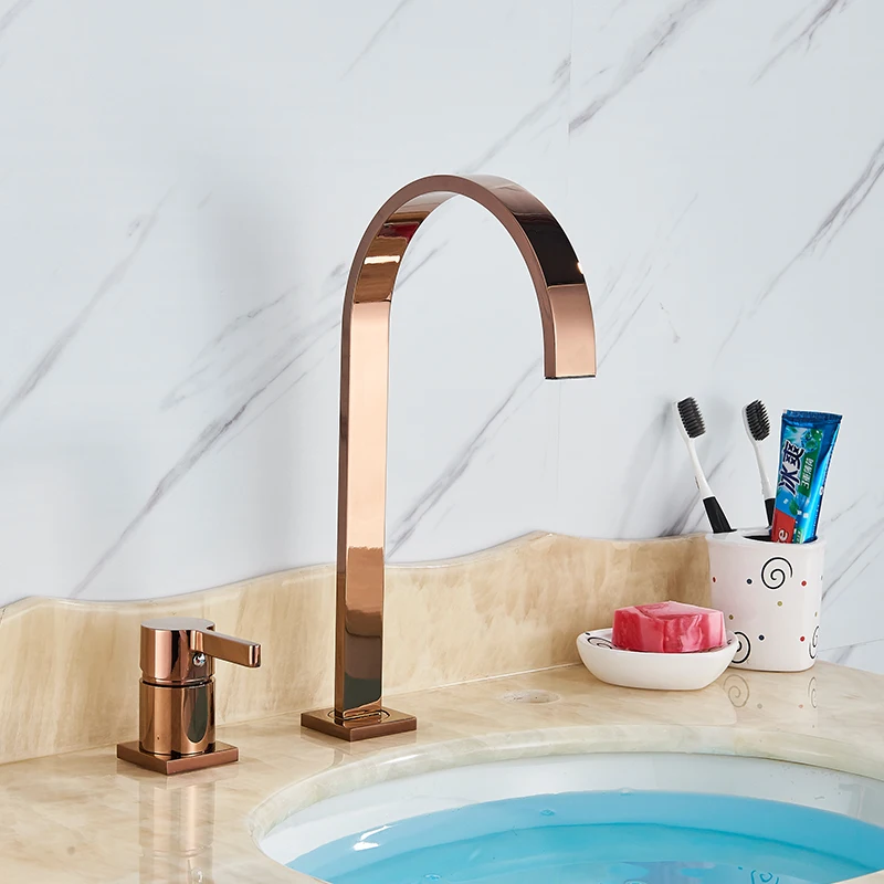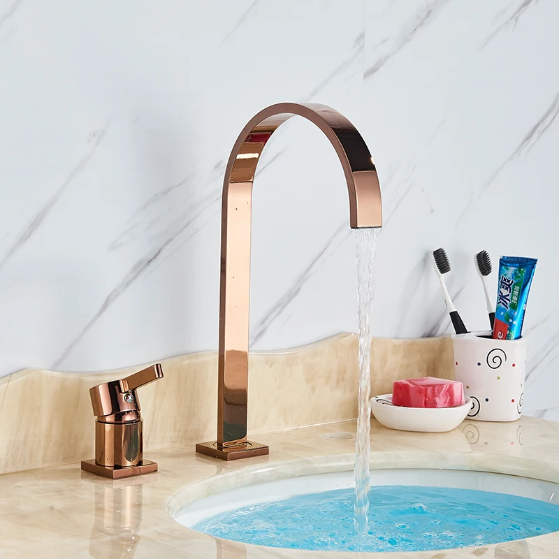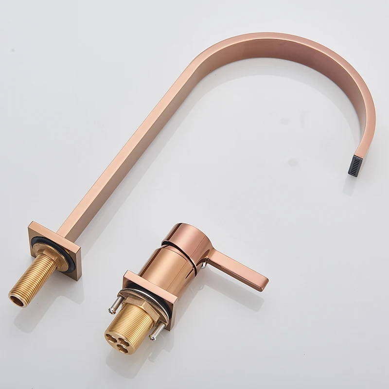 Смеситель для раковины из розового золота, сверхдлинный водопроводный кран для ванной, с двумя отверстиями, с поворотом 360 градусов, матовый золотой