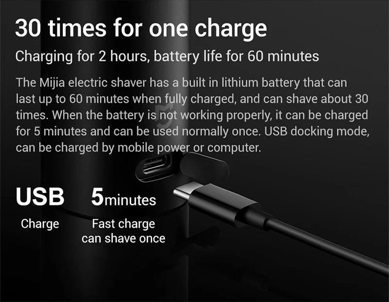 Mijia электробритва имеет встроенную литиевую батарею, которая может работать до 60 минут при полной зарядке и бриться