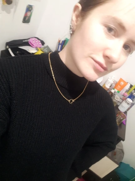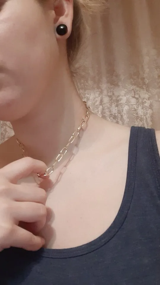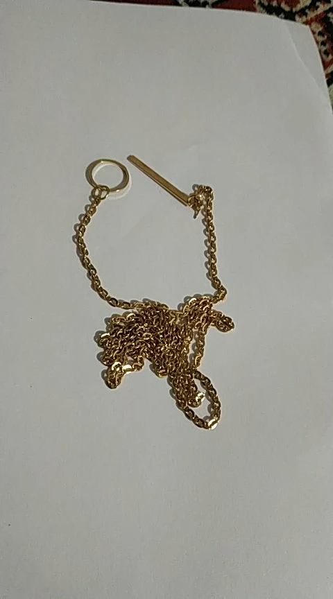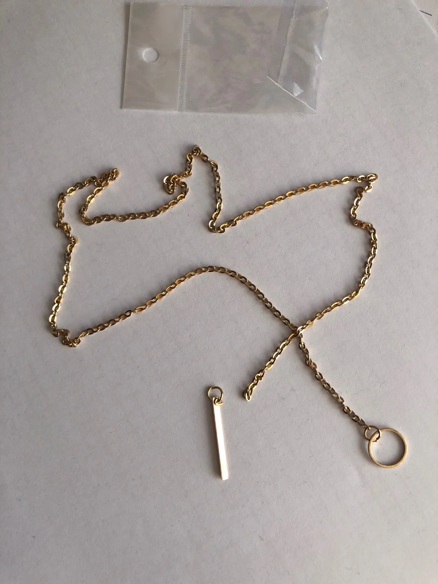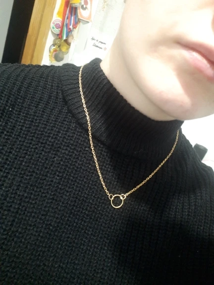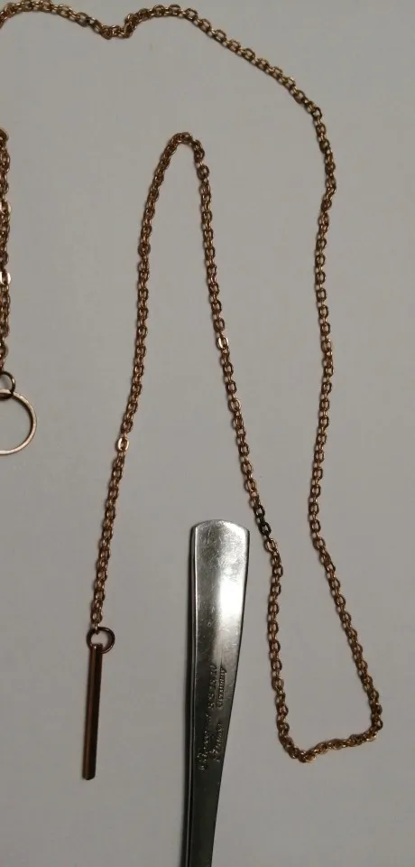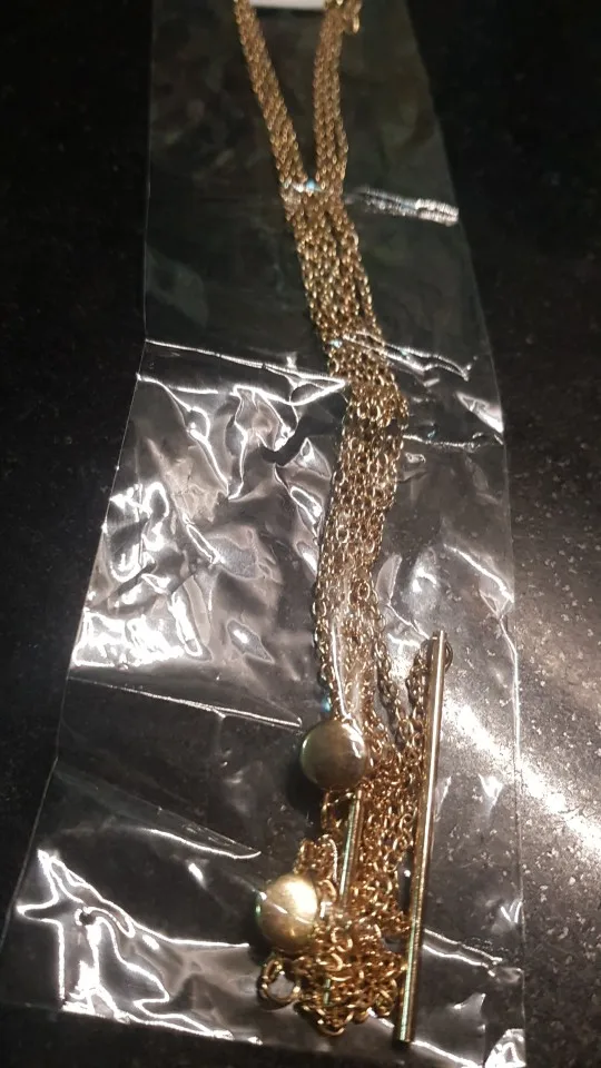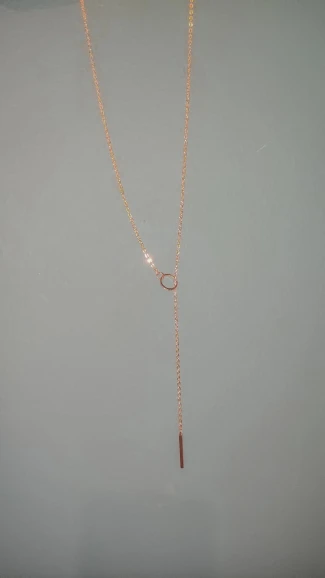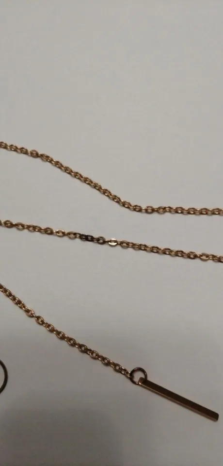 В целом, все как на фото, цепочка достаточно хорошего качества. Единственное - она достаточно длинная (около 63-64 см). Даже если кольцо опустить пониже, конец цепочки уходит очень уж глубоко в декольте. Цвет не желтит и дешево не выглядит, как мне кажется. Я носить буду в любом случае, но если вам нужно, чтобы палочка на конце была видна, то учитывайте длину.