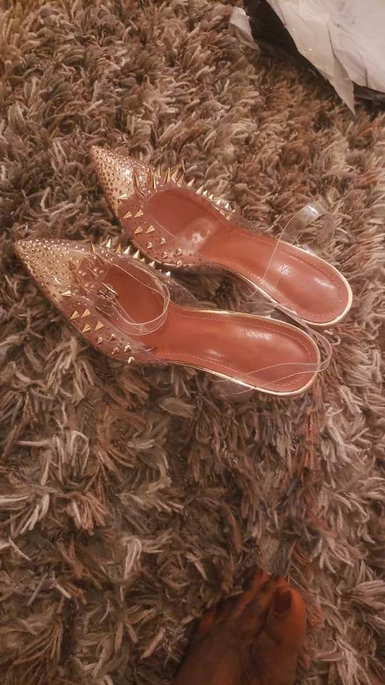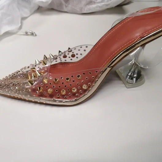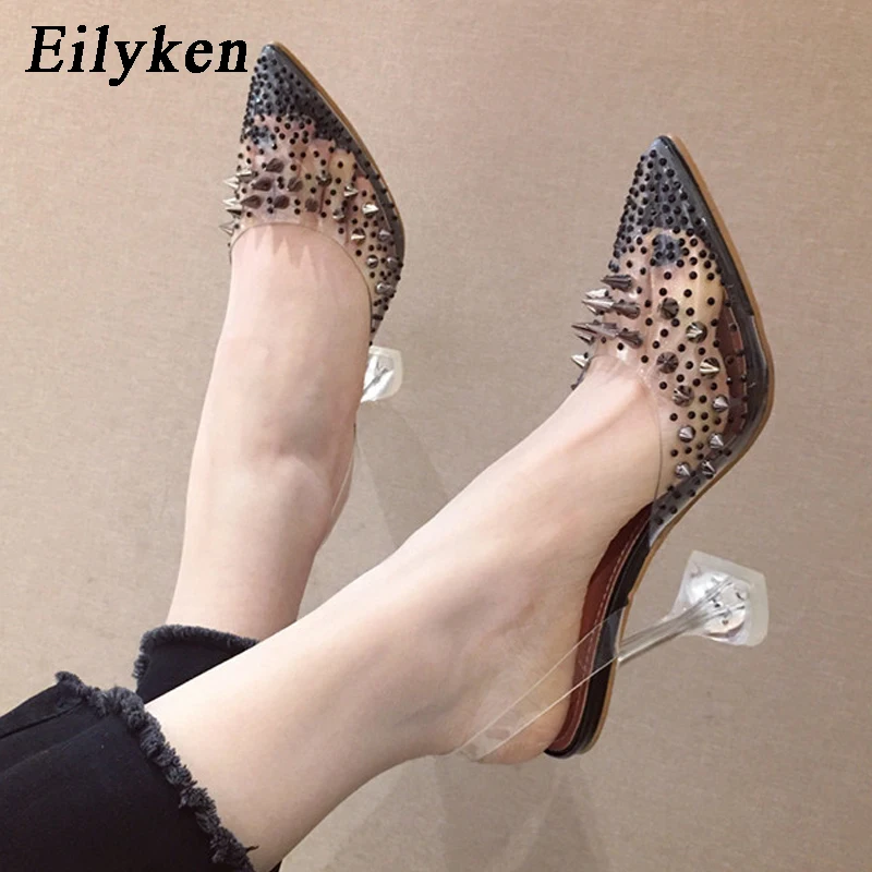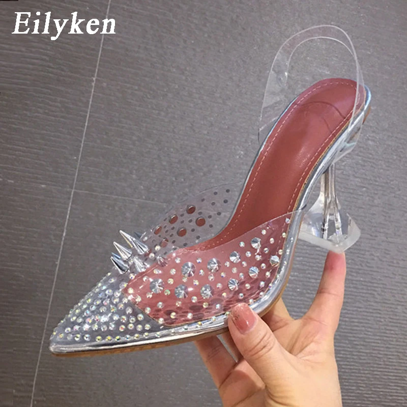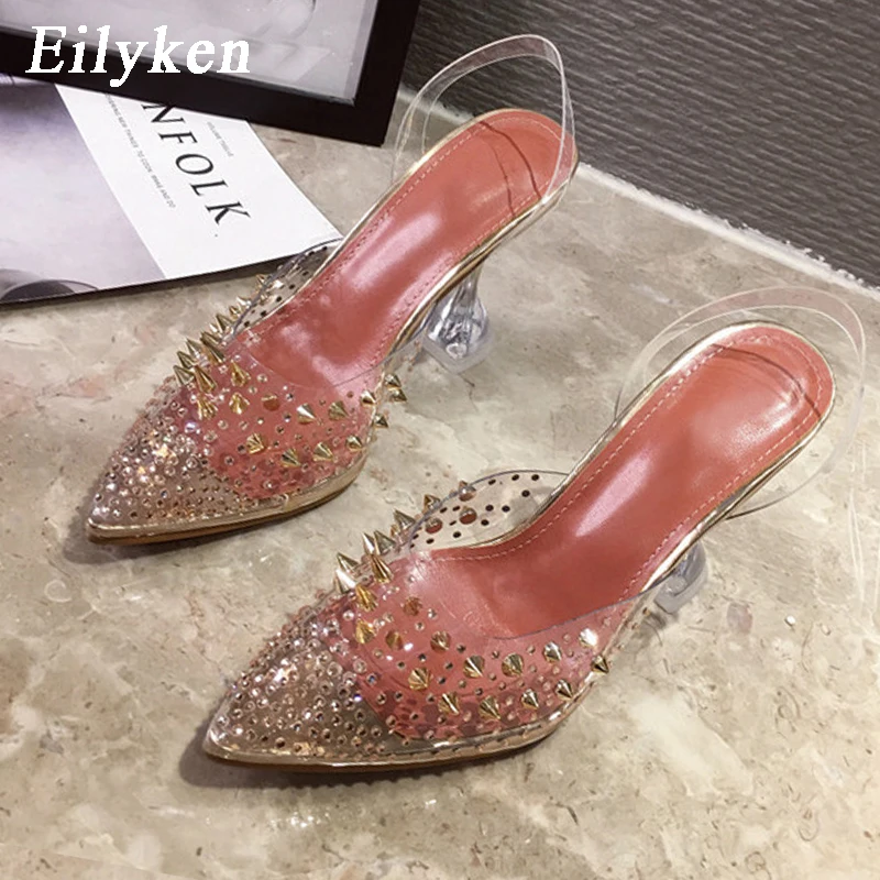 EilykenНовинка 2022 года; Туфли-лодочки из ПВХ с прозрачными заклепками и стразами; Цвет золотой, серебряный; Каблук из плексигласа; Свадебные туфли-лодочки с острым носком и кристаллами