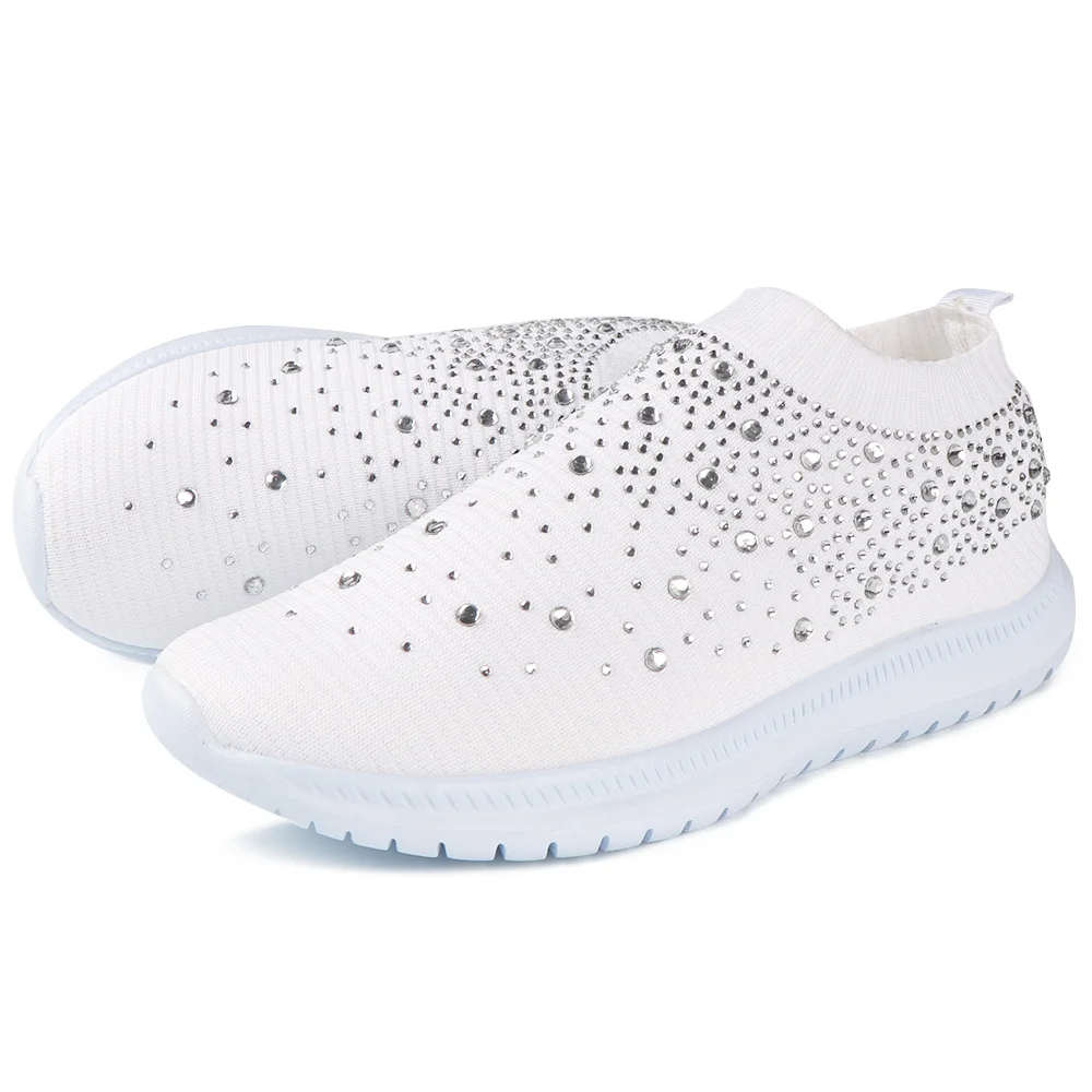 Кроссовки женские на плоской подошве, вязаные лоферы, Вулканизированная подошва, без застежки, повседневная обувь с кристаллами, белые