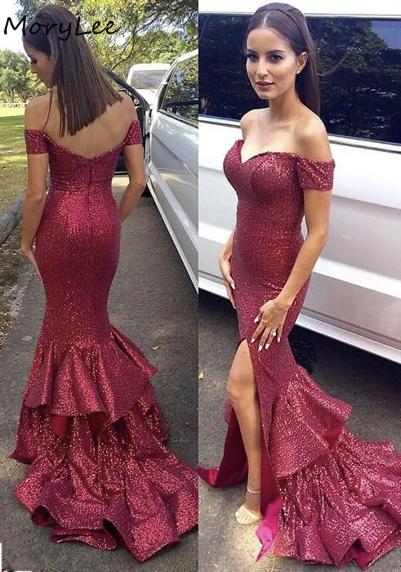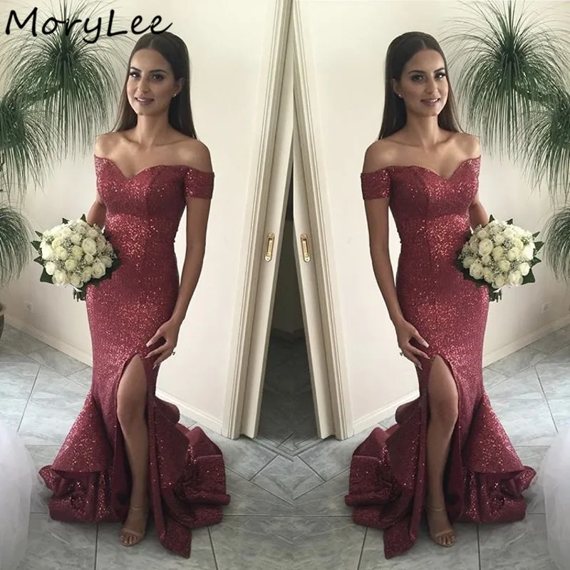 Блестящие платья для подружек невесты с открытыми плечами, юбка-годе в пол, с Боковым Разрезом, со шлейфом и блестками, Свадебные Платья для подружек невесты