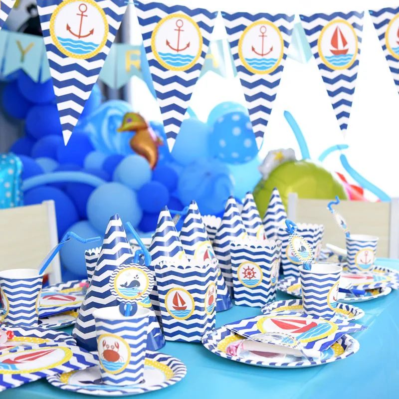Ocean принадлежности для тематической вечеринки DIY Детские украшения на день рождения, набор одноразовой посуды, бумажные тарелки, чашка, скатерть