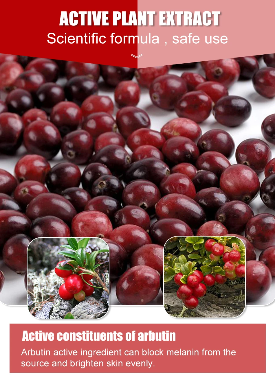 Содержит арбутин и никотинамид, может быстро проникать в кожу, эффективно препятствует активности тирозиназа в коже, блокирует образование меланина, И непосредственно сочетаются с тирозиназой для ускорения разложения и выведения меланина. Уменьшает пигментацию кожи, удаляет пятна и веснушки и не вызывает токсичных, раздражающих, аллергенных воздействий на меланоциты, делает кожу яркой и гладкой