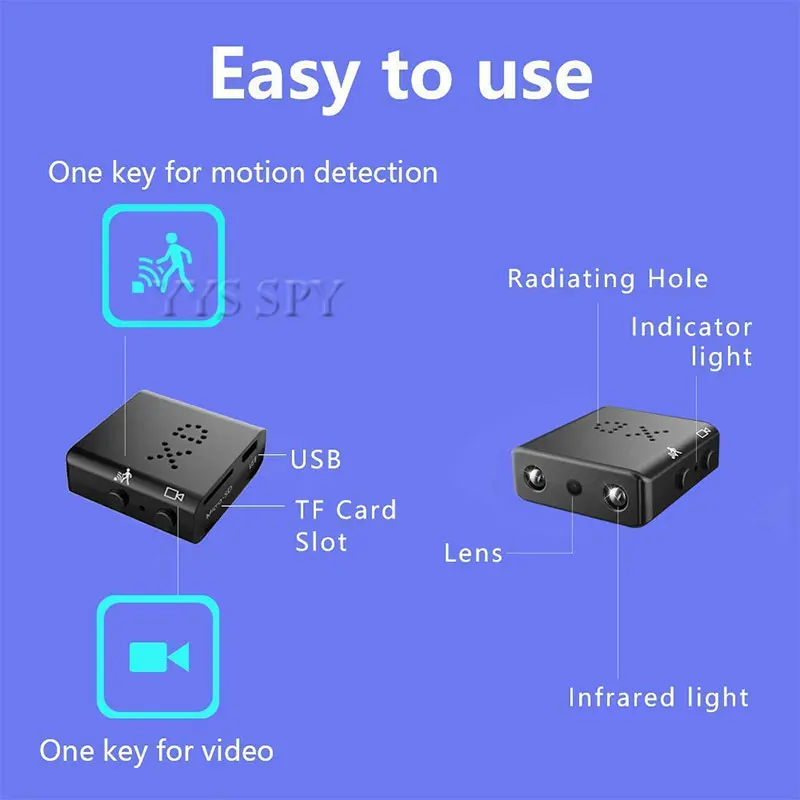 Эта мини-камера видеонаблюдения измеряет только 1,1x0,4x1,1 см. Его небольшой размер позволяет куда угодно спрятаться. Несмотря на небольшой размер, он может похвастаться вивидными, четкими изображениями при разрешении 1080P HD. Он оснащен двумя лампами ночного видения 5x8 мм (расстояние ночного видения до 5 метров) и лампами 940 нм. Может записывать без вспышки и с помощью ИК-подсветки, ночное видение автоматически активируется и деактивируется при обнаружении изменения светильник. Камера проста в использовании и имеет функцию обнаружения движения в один клик и видео в один клик. Вы также можете легко зацикливать видео, показывать или скрывать отметку времени.
