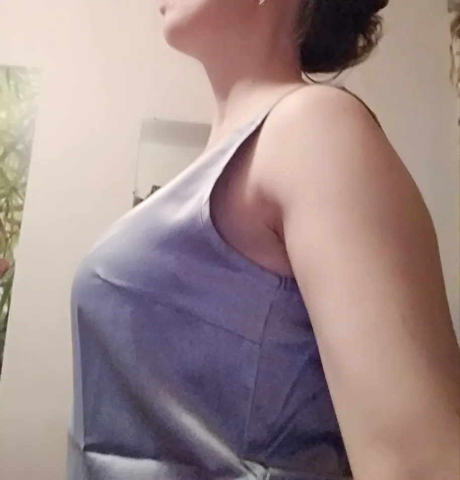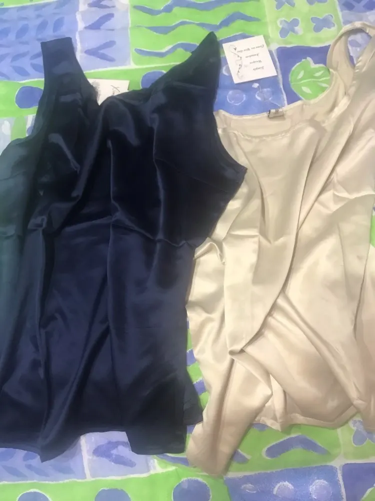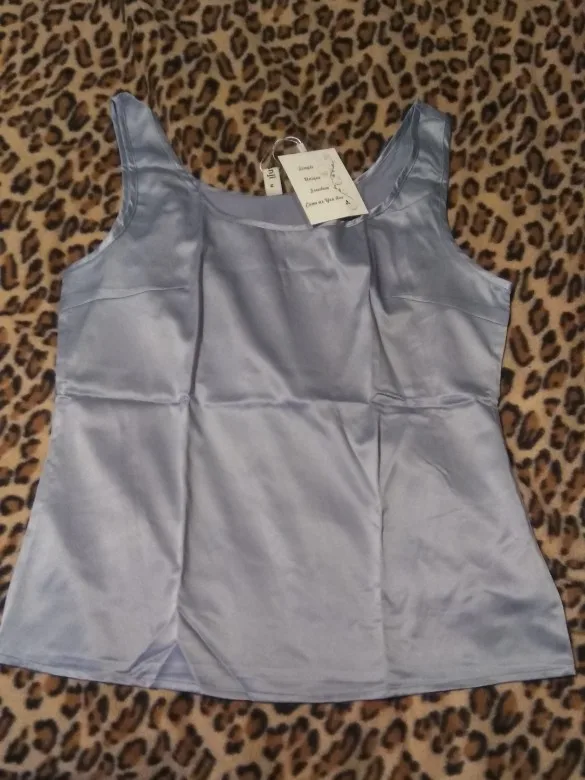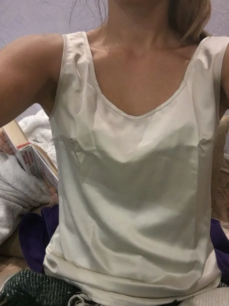 Атласный топ на бретелях, шелковистый, с круглым вырезом. В груди есть вытачки, это очень важно для большой груди. Размер соответствует шкале.