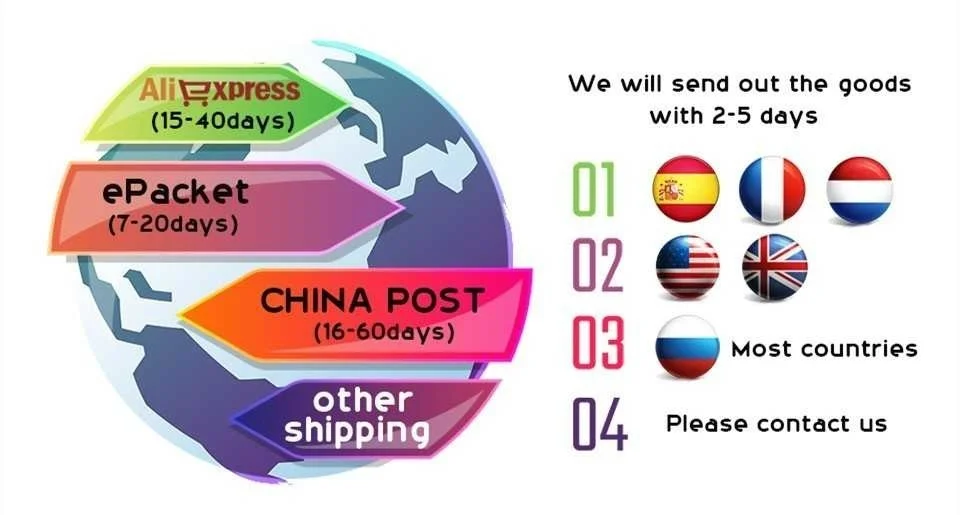 Мы используем EMS /AliExpress Стандартная доставка/Почта Китая авиапочтой/CPAM/Fedex в соответствии с вашим местоположением, и вы получите номер отслеживания в течение 1-5 дней после доставки.Мы делаем это в сотрудничестве с крупными поставщиками логистики, такими как Singapore Post, Correos, Posti Finland, SPSR, DHL и другими. Если вам нужно, пожалуйста, свяжитесь с нами, чтобы выбрать.