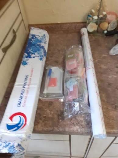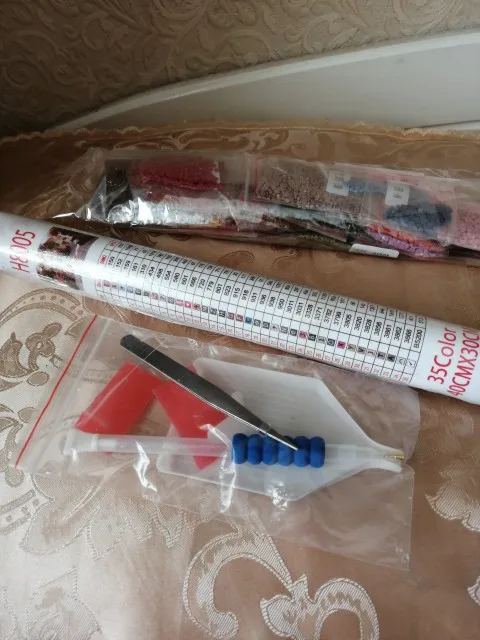 вышивка пришла очень быстро,получала на почте,упакована в коробку,картина намотана на рулон.стразики упакованы в пакеты