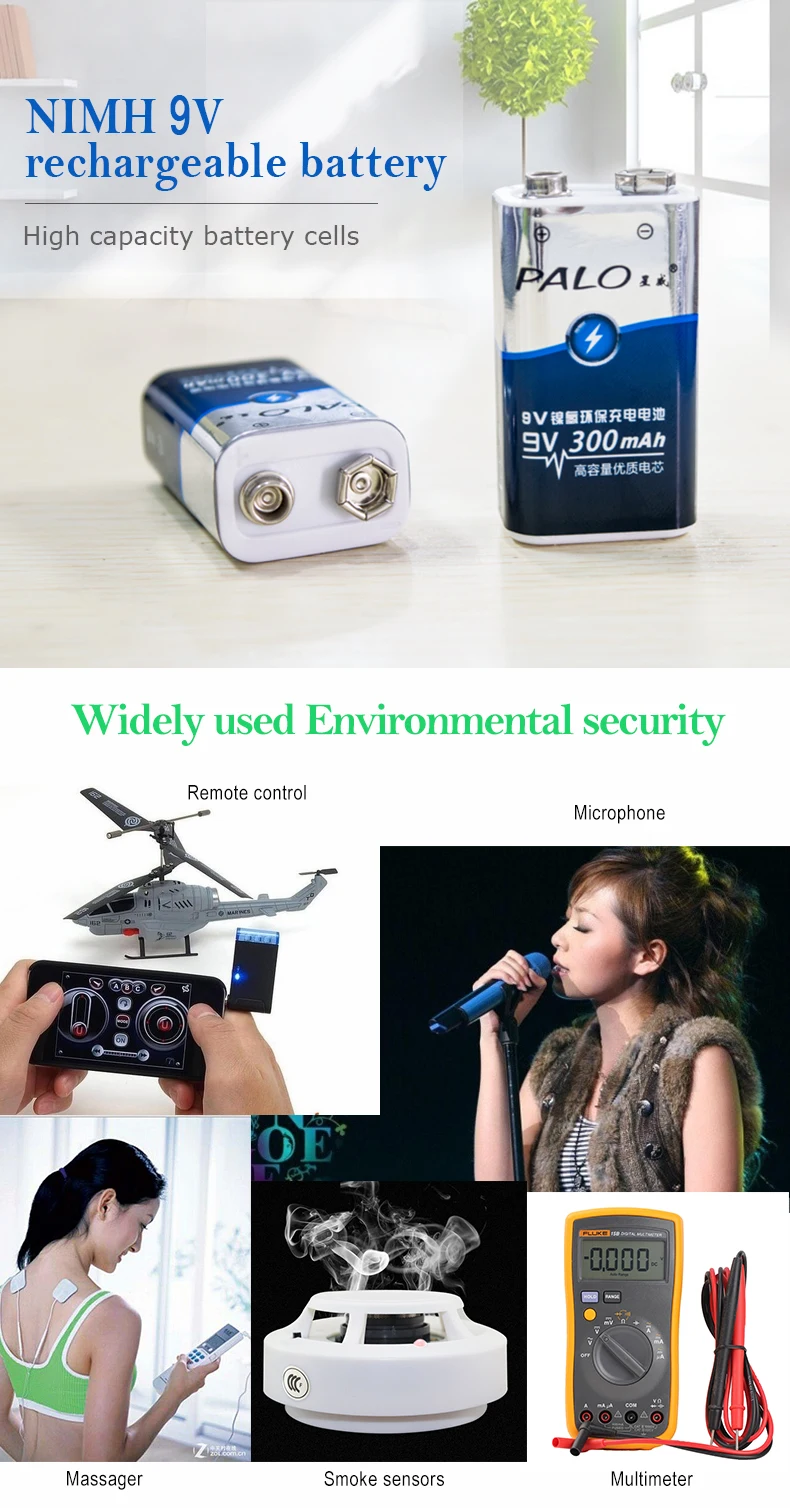 Этот продукт-аккумулятор 9 В, с использованием материала Ni-MH, без памяти, с низким самоотпуском, можно заряжать в любое время. Аккумулятор имеет срок службы в 1800 раз, что экономит больше денег.(Советы: Держите батарею подальше от детей)