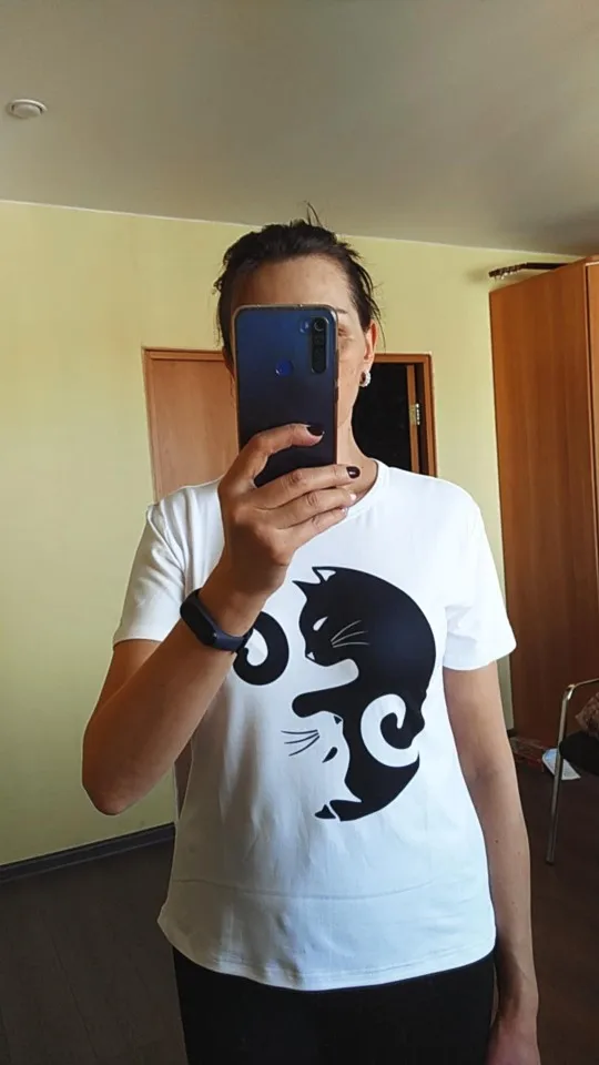 Отправка на следующий день! За что отдельное спасибо! на размер 46 заказала XL, так как видела, что футболка в обтяжку, хотелось посвободнее.. поэтому плечи чуть больше. Футболка приятная к телу. Рисунок, я бы сказала, немного матовый ( не такой яркий чёрный, как на фото). Только ручная стирка. Сшито все очень аккуратно, никаких ниток торчащих.. внутри, низ оверложен Я брала специально для лука в черно - белом цвете, под жилет с длинными фалдами. в комплекте ,выглядит прекрасно.