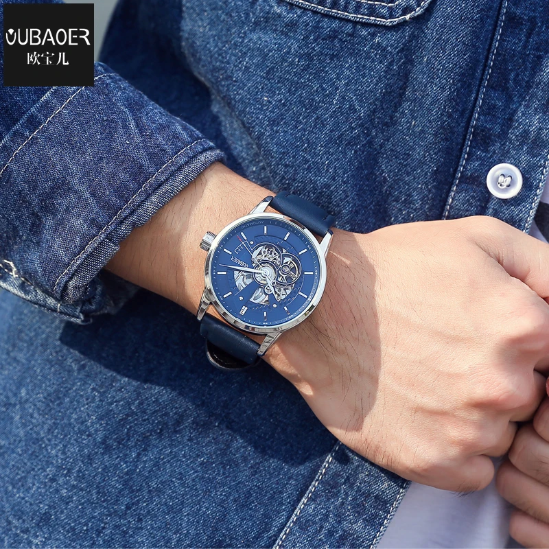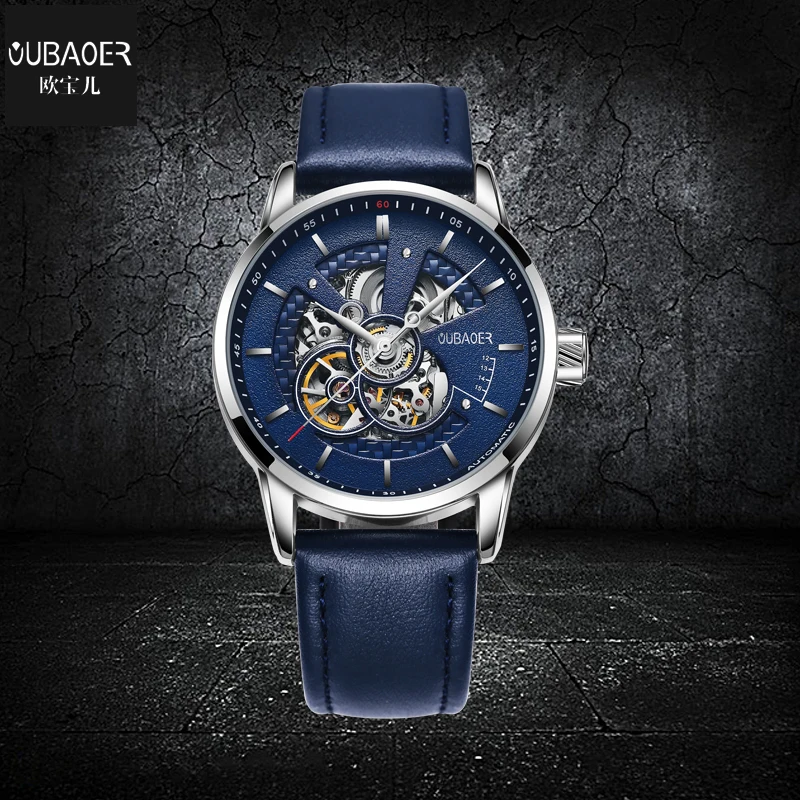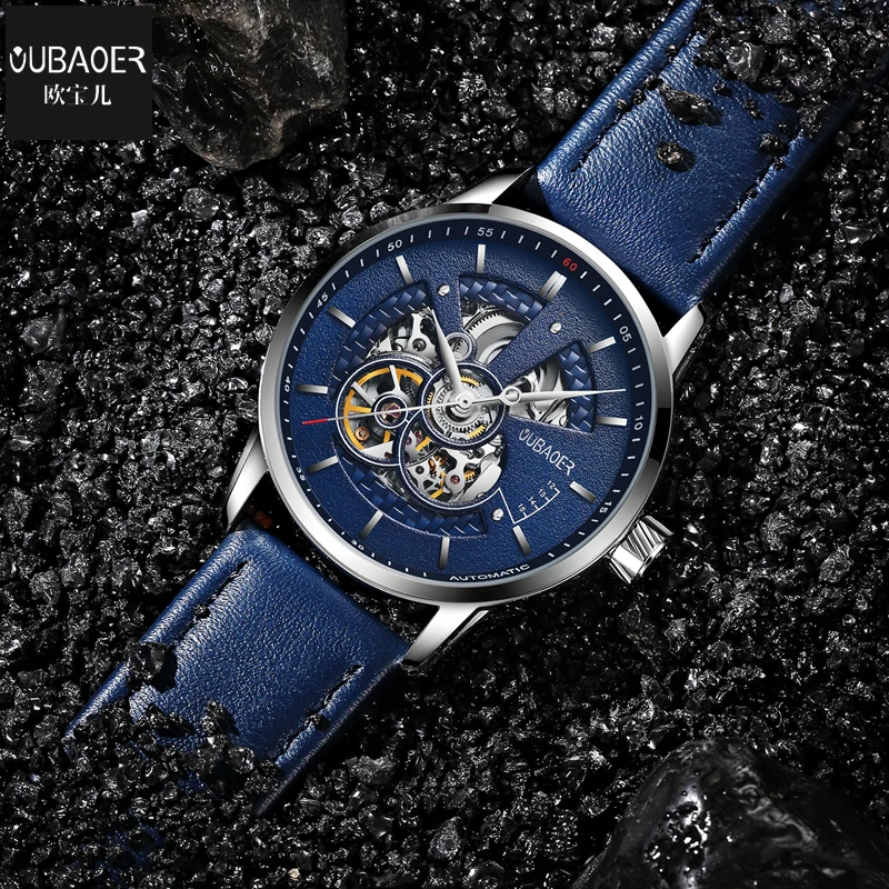 Часы-скелетоны Мужские механические, модные брендовые Роскошные автоматические часы-скелетоны синего цвета с кожаным ремешком, 2020