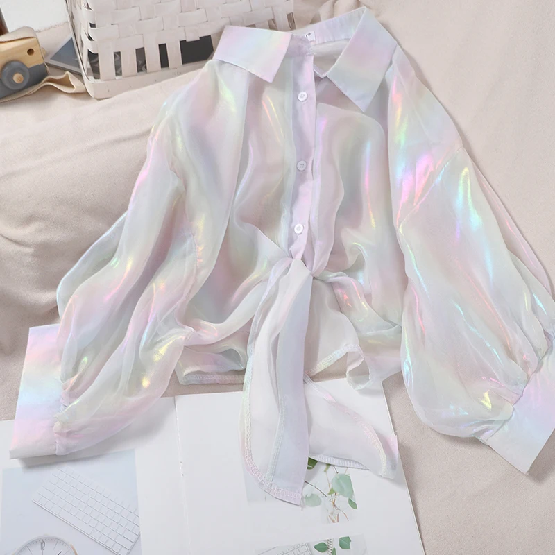Блузка женская шифоновая с длинным рукавом, элегантный топ с блестками, Повседневная пикантная прозрачная рубашка на пуговицах, на весну