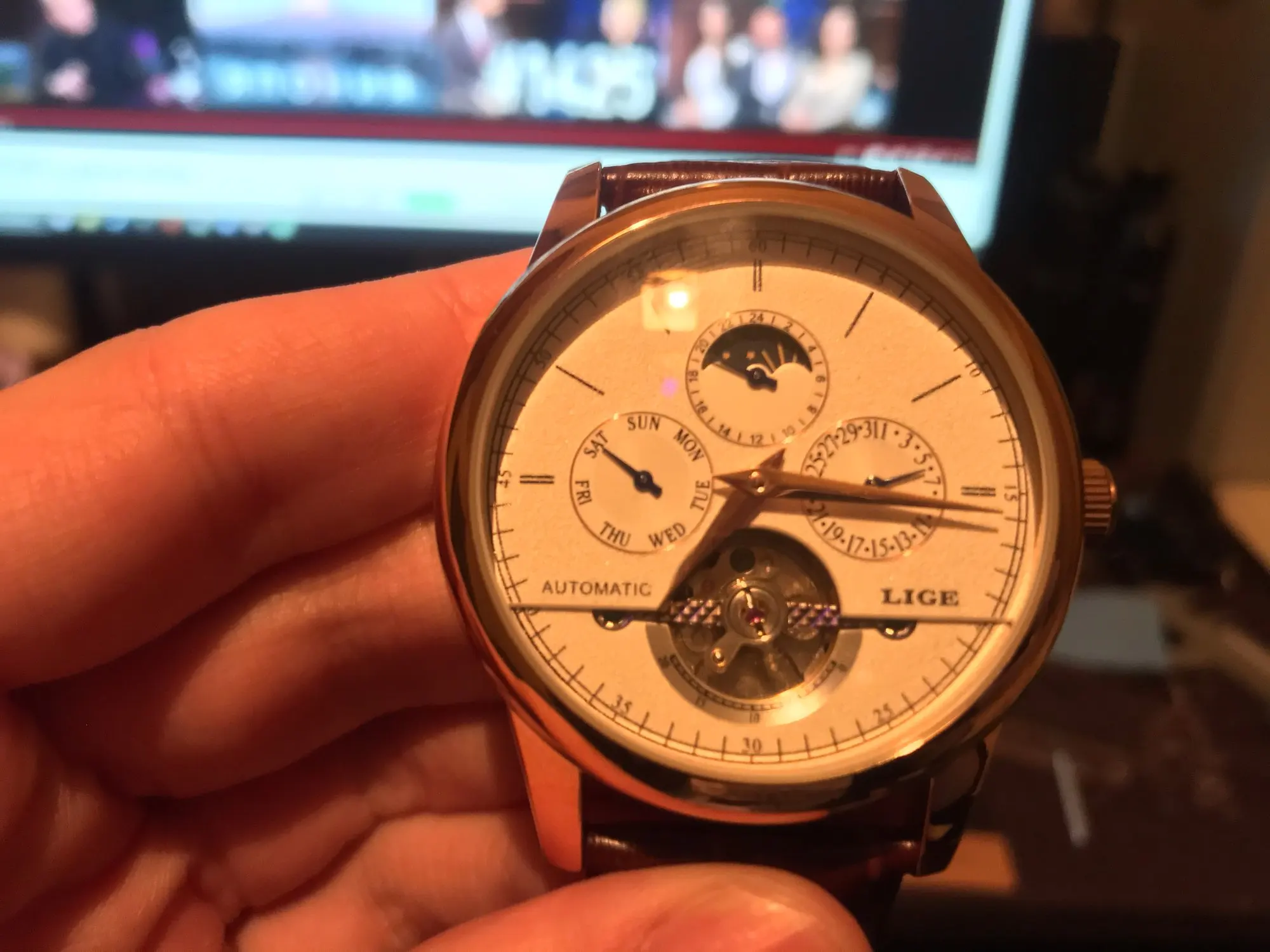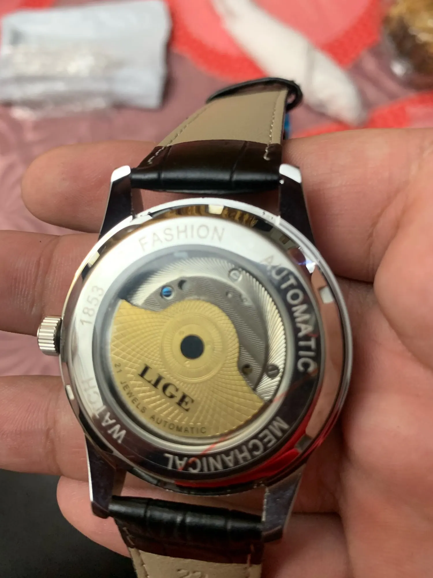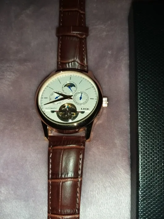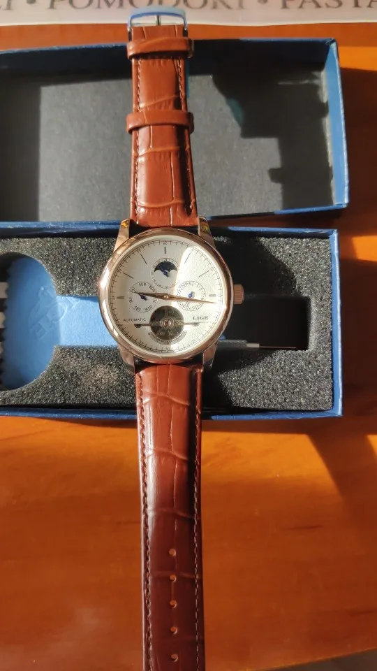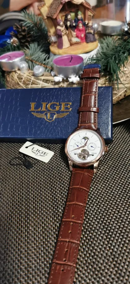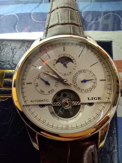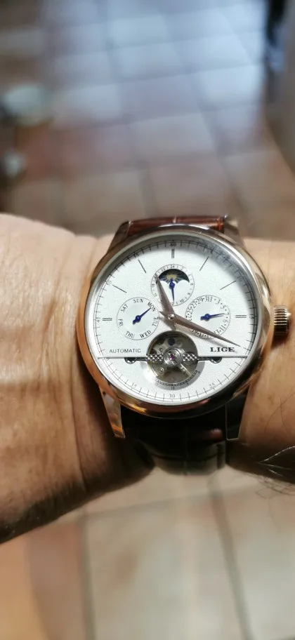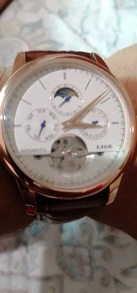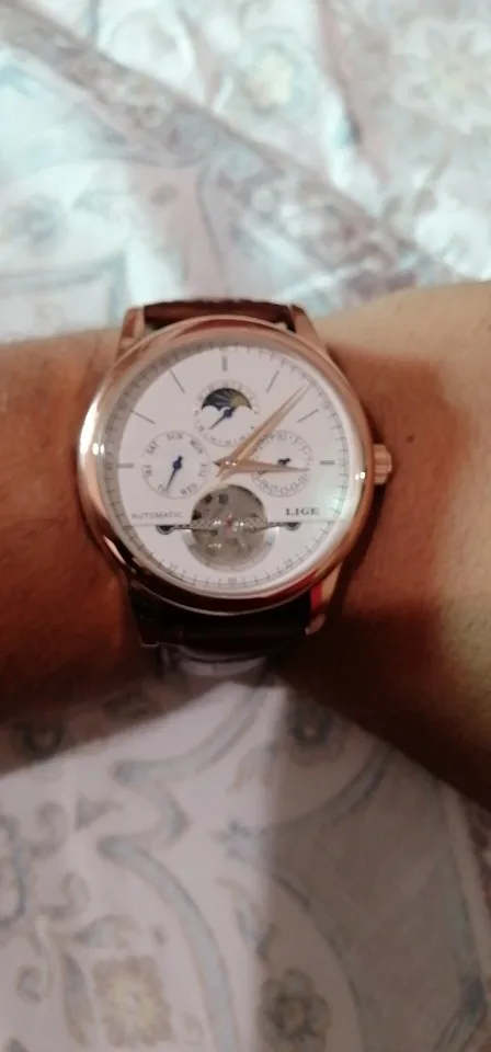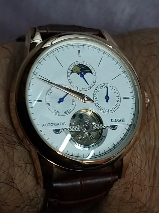 Часы LIGE муж.наруч. модель Gold white. за 2740₽. Заказ оформил 12.02 привезли 15.02. СПб. Качеством доволен. ремешок пахнет хим. похоже на кож.зам. не эксперт, механика 100% авто подзовод. цифры закрыты 20 и 40 см.на фото. От себя скажу для механики цена и качество соответствует.