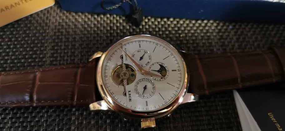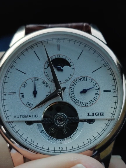 Великолепно. Давайте начнем с движения. Тот, который я получил, абсолютно бесшумный, когда носил нормально, с волнением он производит минимальный звук. Фрезерование, которое можно увидеть через задний кристалл, является абсолютно великолепным, однако его просто тщеславие. Вы видите немного реальных внутренних шестеренок, хотя скелетонизированные части были добавлены к пластине, чтобы увидеть драгоценные камни. Корпус и кристалл. Отличительное покрытие AR придает нежно-голубой голографический эффект при надлежащем освещении. Качество кристалла-класс А, невероятная четкость и прочность. Это минеральный кристалл с голубым антиотражающим покрытием, а не Сапфир. Ремешок и застежка. Натуральная кожа с прямой форменной строчкой. Застежка с глубокой гравировкой с логотипом бренда LIGE, но ее сложно прикрепить, очень сложно собрать ее вместе с одной стороны. Почти не спадает.
