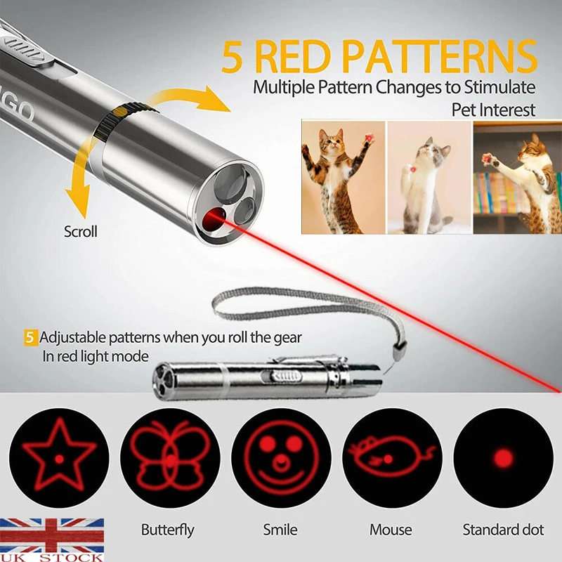 1. Много режимов работы: Красный светильник с забавным кошачьим режимом имеет 1 красную точку, 4 узора, синий светильник, режим обнаружения банкнот, белый светильник, аварийный светильник, режим ing.