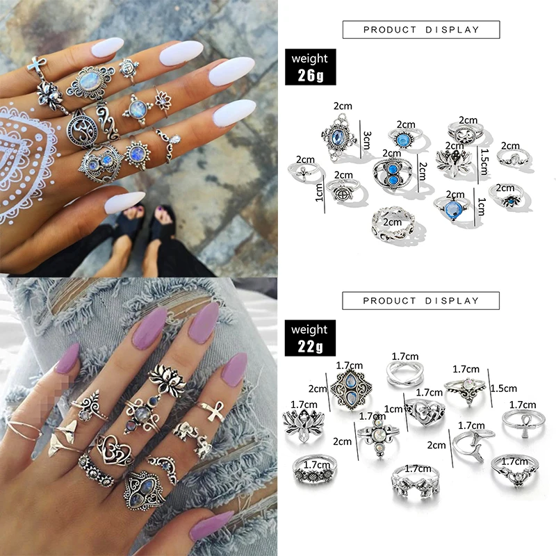 Кольца пришли довольно быстро, их не 20 как написано в описании и некоторые из них не соответствуют описанию(фотке). по кольцам видно что это дешёвый сплав. на первой фотке я расположила их так как на картинке, а на остальных так как реально их носить исходя из их размеров.