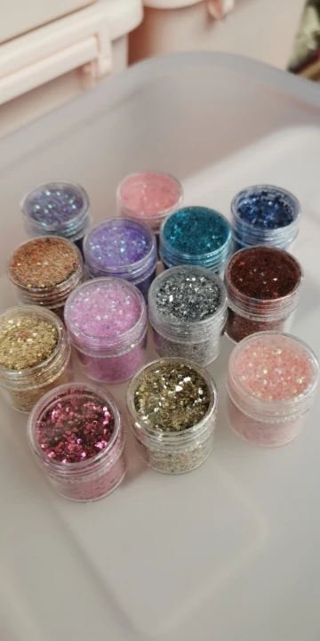Очень крутые блестки, баланс крупных и мелких идеальный. Я добавила в них немного алоэ-гель, для того, чтобы их можно было использовать для тела. Для эксперимента я пробовала миксовать их с блестками других цветов, также от этого продавца. Получаются интересные вариации:)) так что прикольная идея мешать разные цвета.